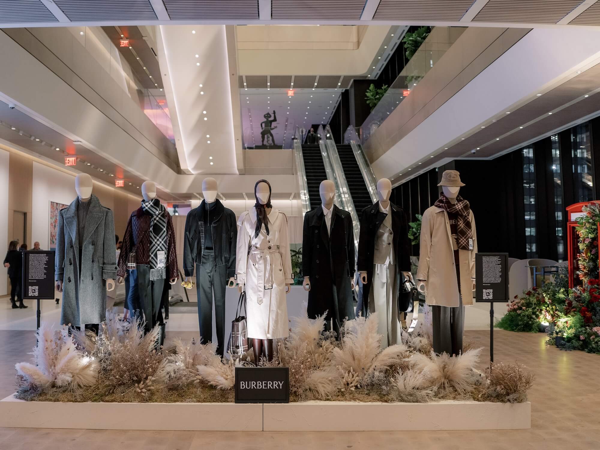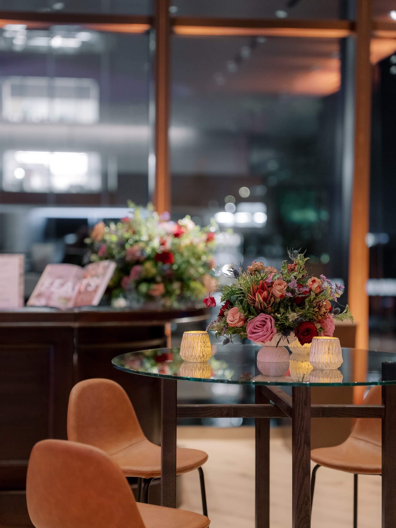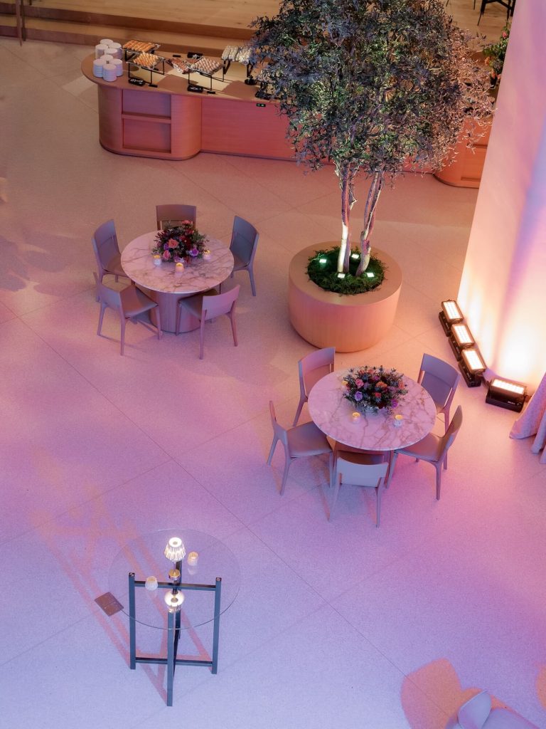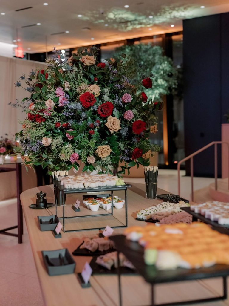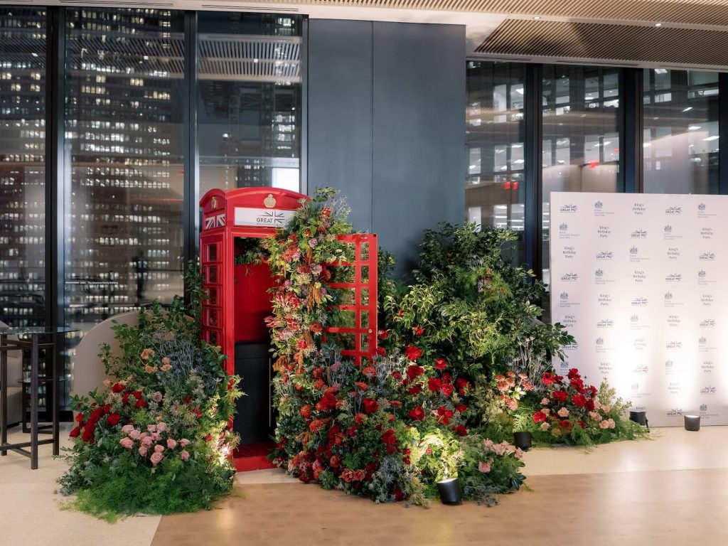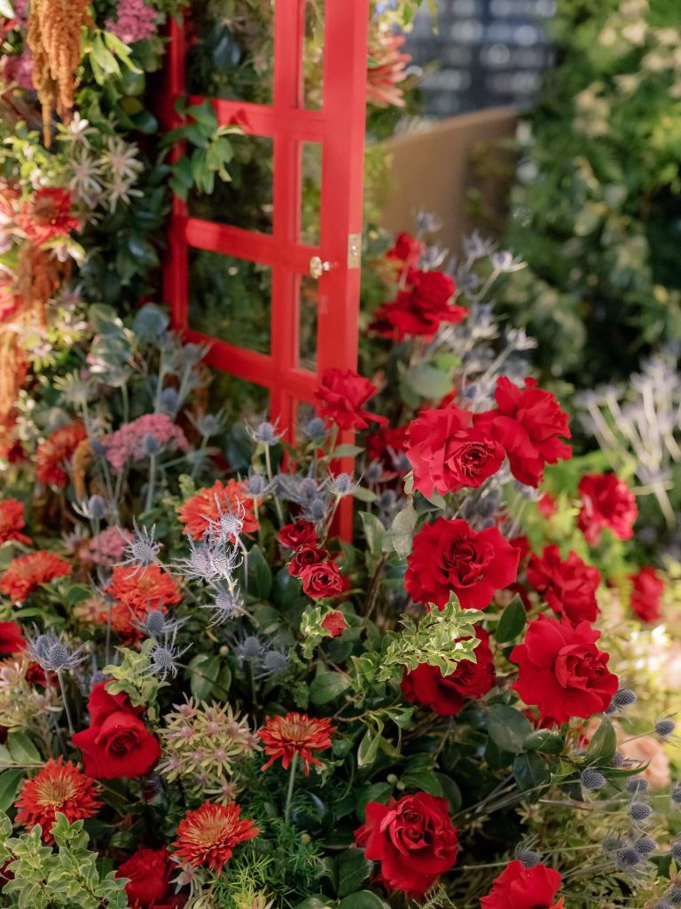 Drawing inspiration from quintessential British iconography, Walshe incorporated a vivid red telephone box as a playful yet elegant feature within the event’s arrival experience. The installation was surrounded by abundant, naturalistic florals in shades of crimson, blush, apricot, and soft green foliage, creating a lush garden moment reminiscent of an English country landscape. These floral compositions continued throughout the space, appearing as sculptural centerpieces on cocktail tables, bar arrangements, and buffet displays, blending British garden romance with the sleek contemporary interiors of the venue.
