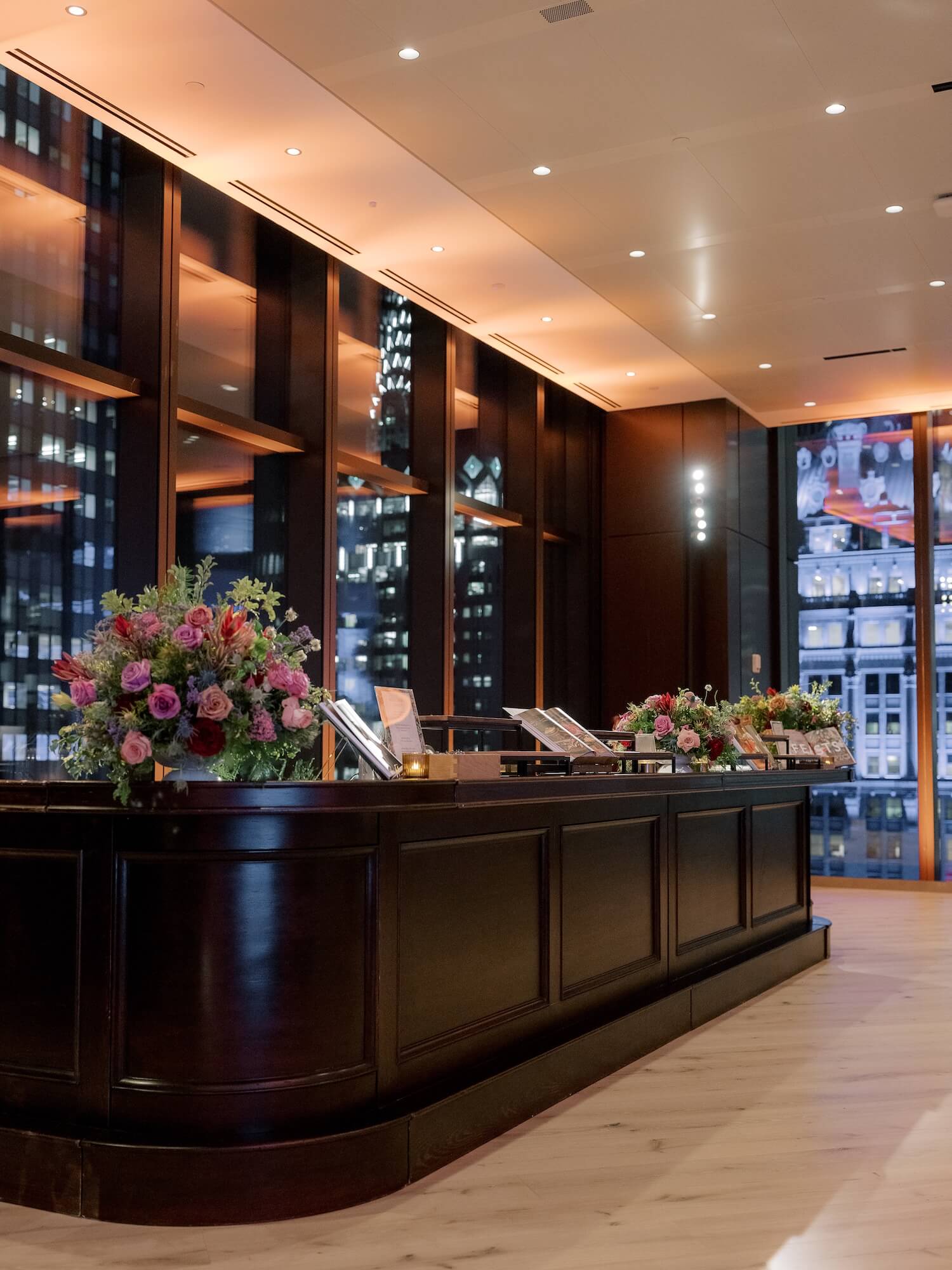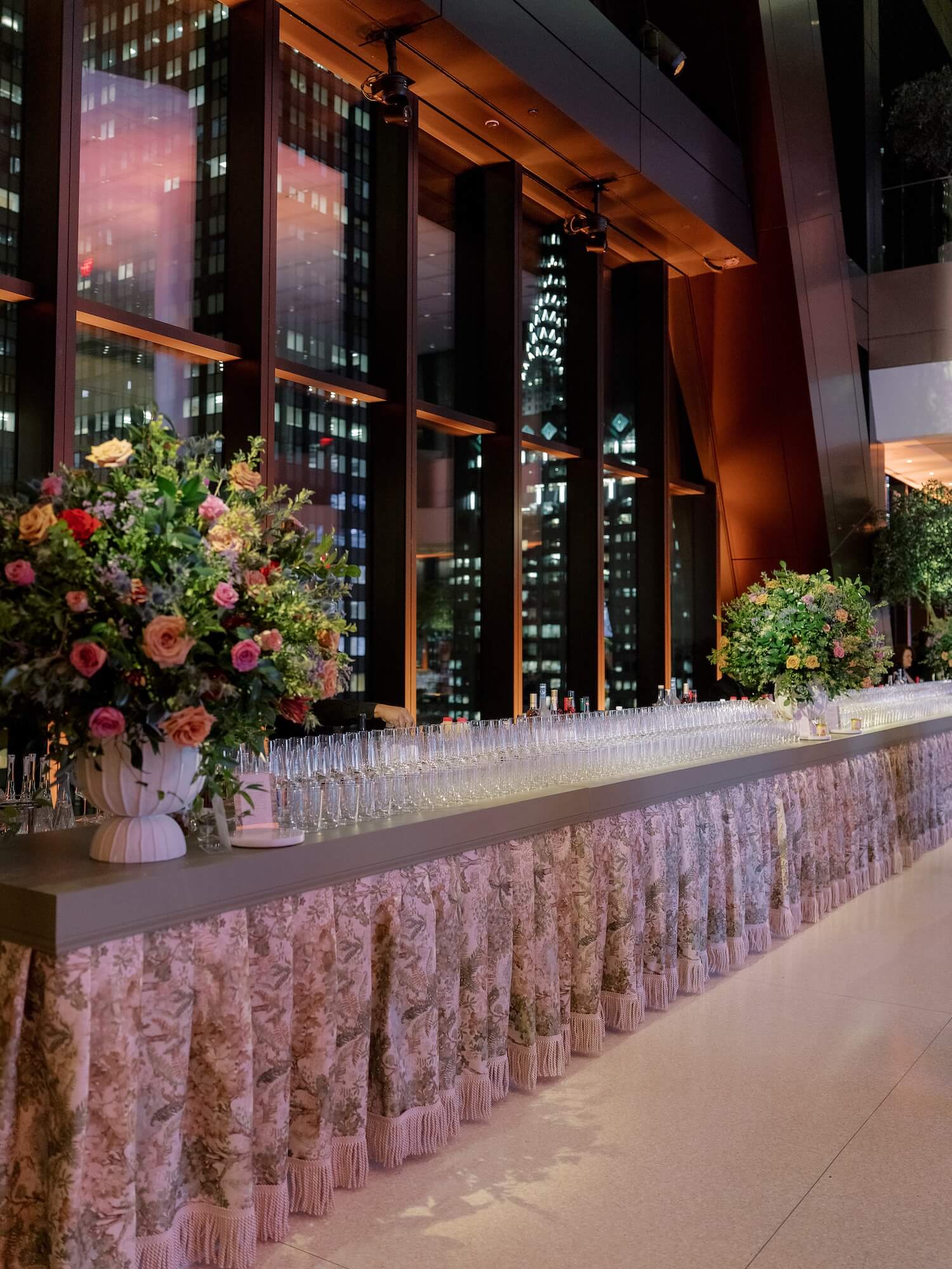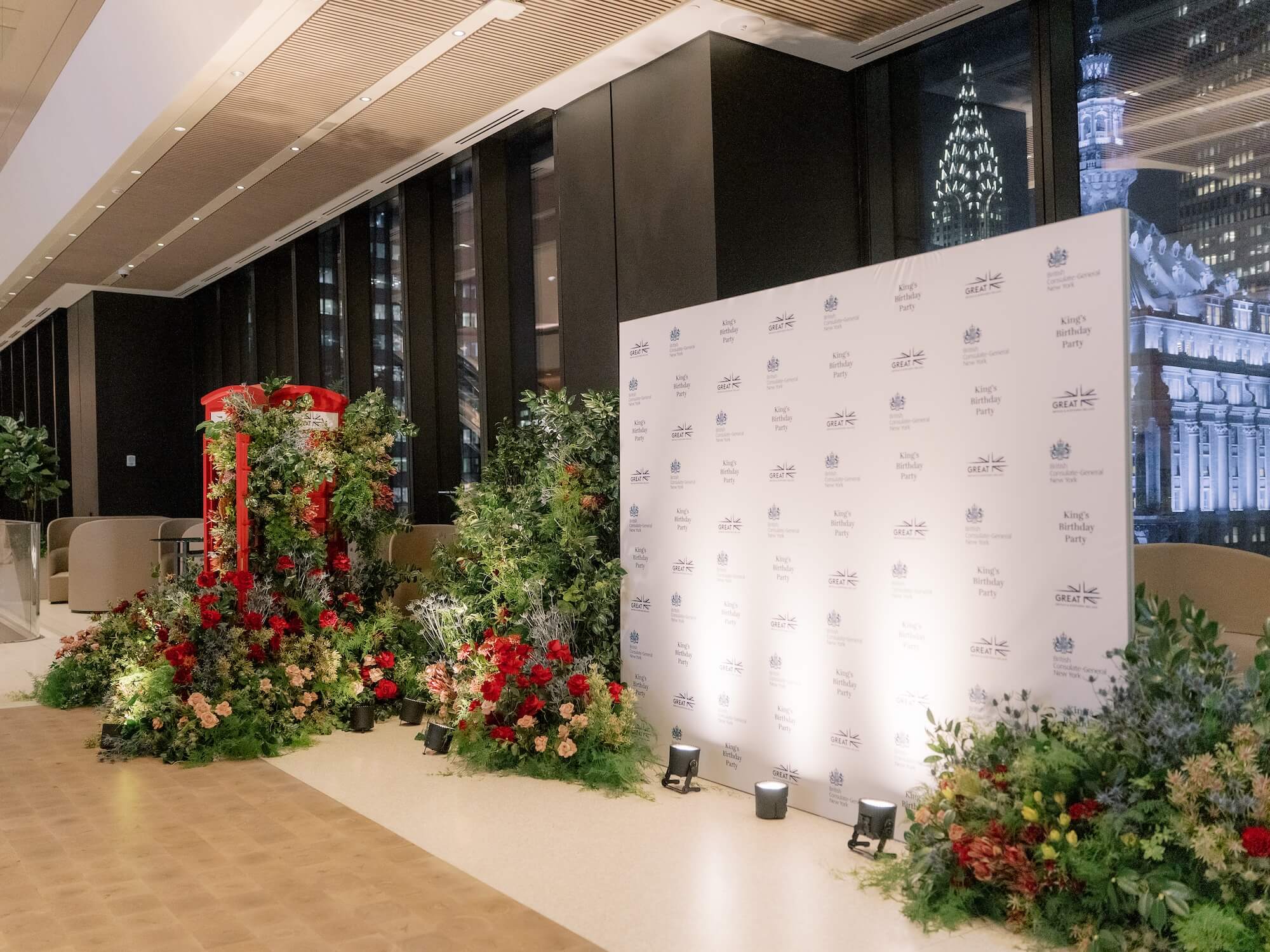Larry Walshe designed an elegant corporate celebration for the King’s Birthday in collaboration with J.P. Morgan, transforming the striking architecture of the J.P. Morgan building in New York into a refined setting that celebrated British heritage while embracing contemporary sophistication. The design concept balanced the grandeur of a diplomatic occasion with the modernity of the venue’s soaring glass walls and panoramic views of Manhattan’s skyline.