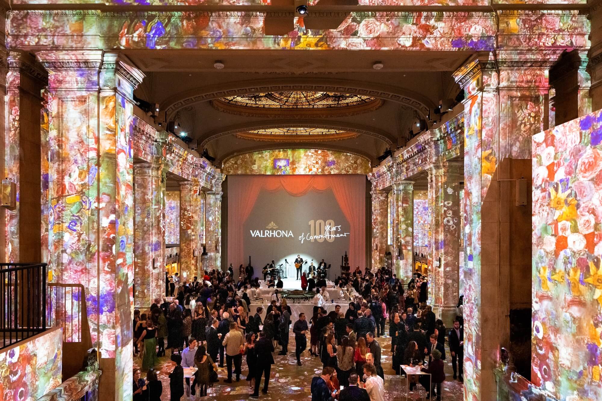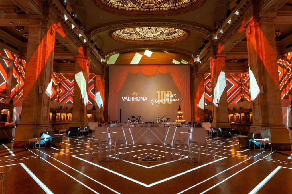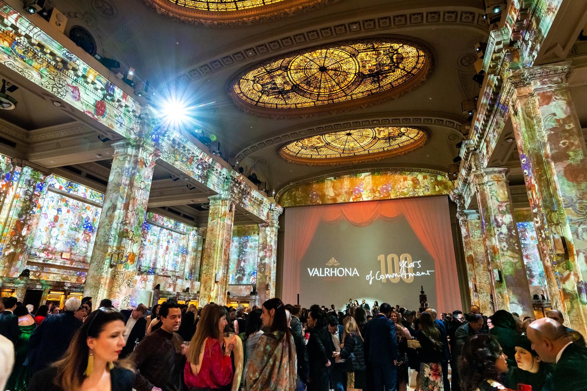 The visual narrative of the event was inspired by the rich sensory world of chocolate itself—deep cocoa tones, molten golds, and bursts of jewel-like colour reflecting the complexity and creativity of Valrhona’s craft. Throughout the evening, projections cascaded across the marble columns and vaulted ceilings in painterly textures reminiscent of cacao blossoms, swirling cocoa, and abstract confectionery palettes. These immersive visuals transformed the hall into a living artwork, enveloping guests in a sensory experience that mirrored the brand’s passion for flavour, artistry, and innovation.
