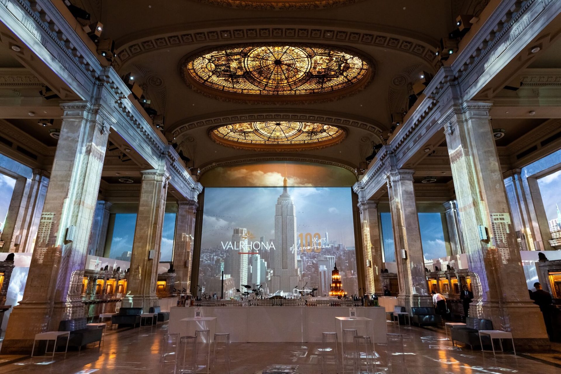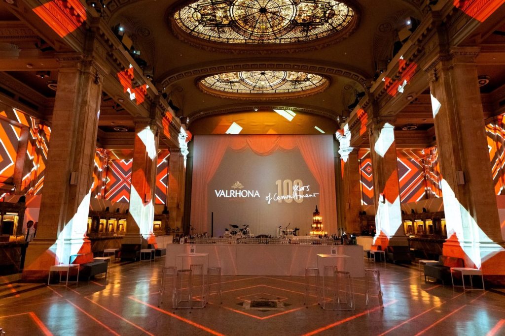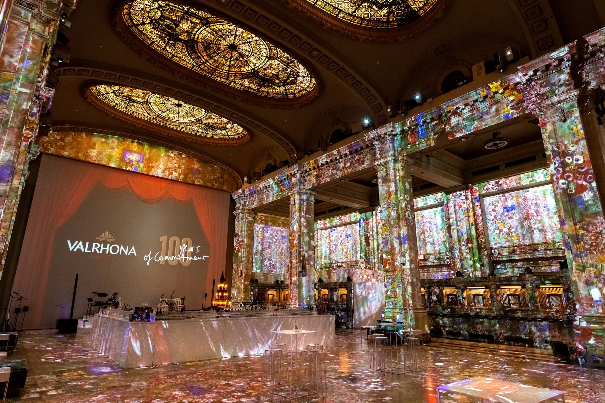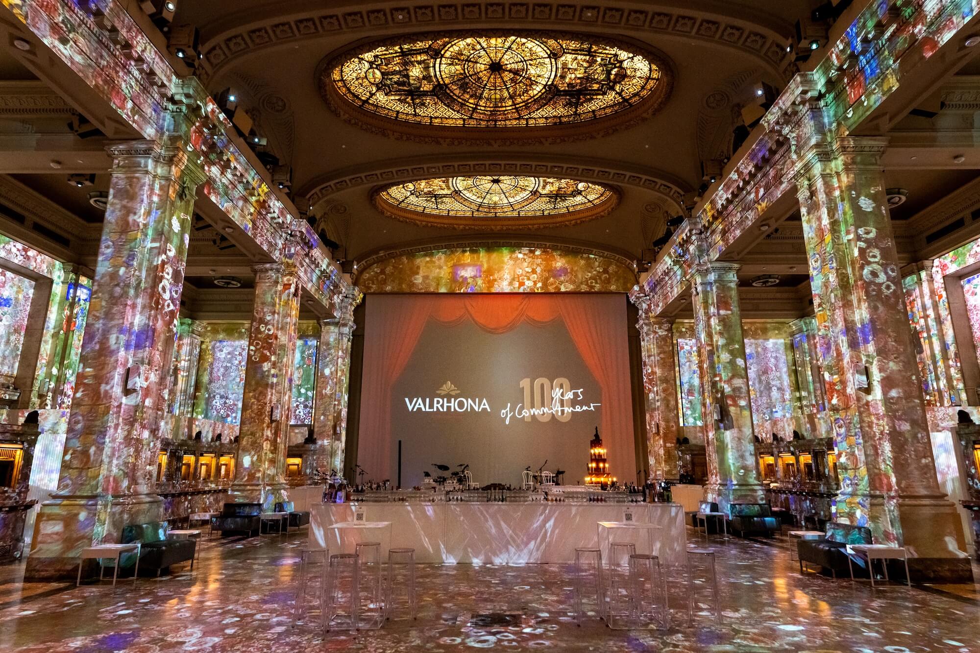Larry Walshe conceived an immersive corporate celebration for Valrhona at the historic Halls des Luminares in New York, transforming the grand Beaux-Arts architecture into a theatrical canvas of light, colour, and movement. Drawing inspiration from the building’s soaring columns, ornate ceilings, and dramatic scale, the design centred around projection-mapped visuals that wrapped every surface of the hall.