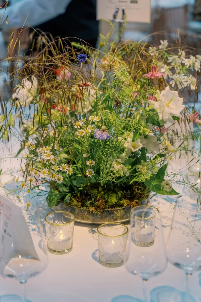 The floral arrangements for the dinner were thoughtfully designed to complement the venue’s historical grandeur without overwhelming the space. Wildflower installations adorned the center of each dining table, with delicate grasses weaving through the blooms, providing a natural flow and balance. Tall arrangements of red poppies, foxgloves, and other seasonal wildflowers were placed strategically throughout the room, adding height and depth to the overall look.