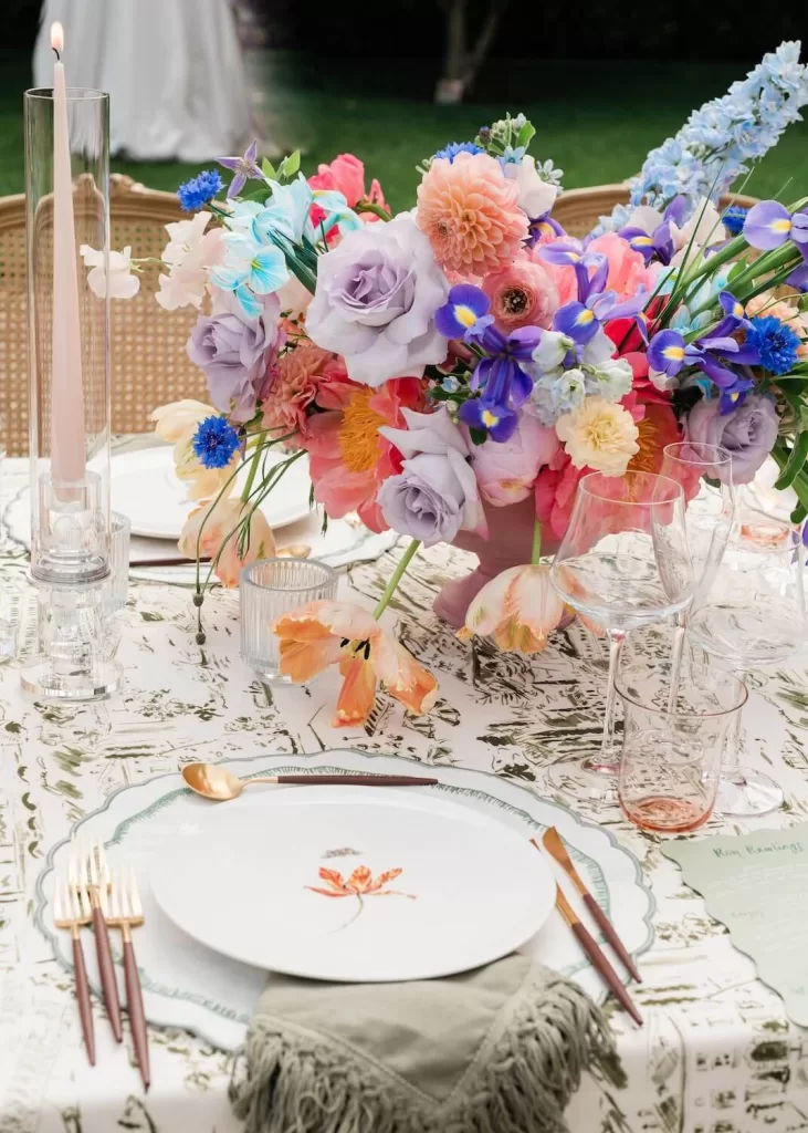 Placed on your square dining tables, a veritable tapestry of blooms from your chosen palette alongside delicate inclusions of mid-summer foliage. Rambling in a gloriously organic manner, the piece will utilize risers at varying heights, each topped with groupings of chic candlesticks to offer visual variety and movement. Gloriously abundant, this garden inspired setting will cover a large surface area to offer a truly sumptuous overall look. Votives will then be scattered throughout to offer a soft, warm glow.
