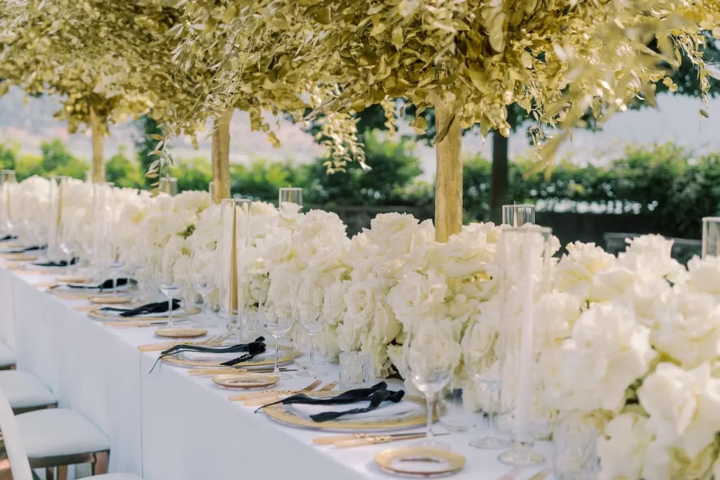 The design was further elevated with golden chandeliers and softly glowing candles, casting a warm, romantic light over the event. Every detail was meticulously planned to reflect the couple’s vision of elegance and luxury, with Larry Walshe’s thoughtful incorporation of gold and white creating a sense of unity between the outdoor ceremony and the indoor reception. This combination of rich florals and opulent golden hues, set against the beauty of Villa Balbiano and Lake Como, transformed the wedding into a magical celebration that was both lavish and intimately personal, leaving guests in awe of the breathtaking surroundings and the thoughtfulness behind every detail.