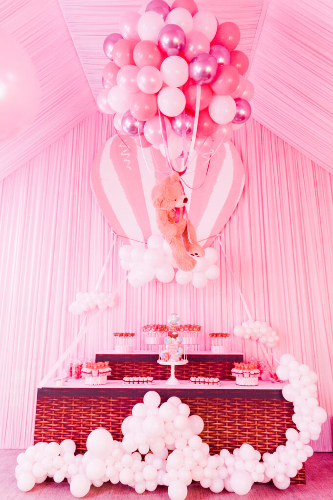 We transformed our clients home entirely by adding soft pink draping to the whole interior. This created a soft and inviting setting with feminine flair before we added a giant hot air balloon food station for decadent cakes and sweet treats. A custom-made cocktail bar and suspended teddy bear installation then brought our theme of Up, Up and Away in the Clouds to life!