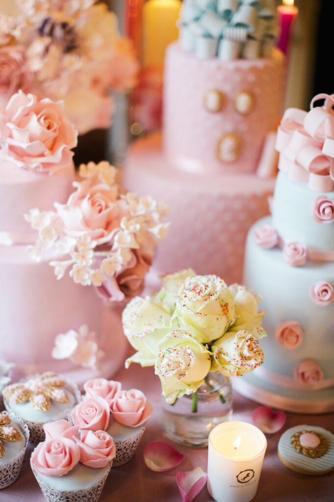 One of the best parts of any children’s party is of course the cake and here, our wonderful client had 5! All were created in our client’s favourite colours, pink and blue, in an opulent and Rococo inspired style. Keeping it playful, these were displayed amongst knots of roses which were hand dipped in white chocolate before being sprinkled with hundreds & thousands.