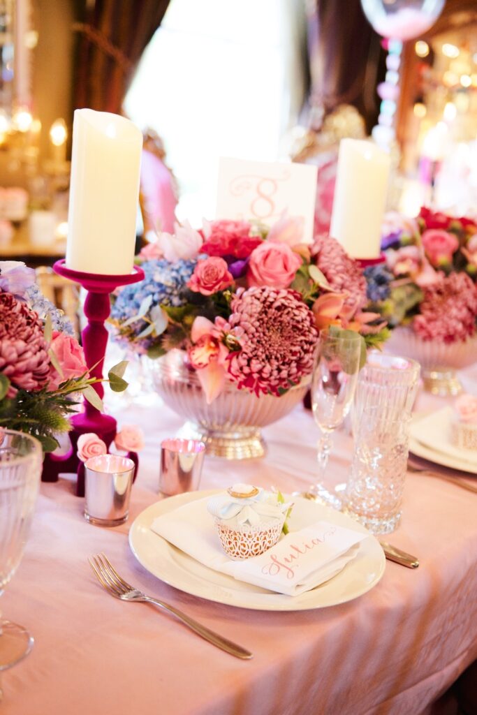 Luxurious flower arrangements were placed along the centre of one long dining tables, each filled with a detail driven scheme of pink and blue tones. Deep berry pink and purple flowers were included to link the two key colours and ensure a cohesive floral scheme.