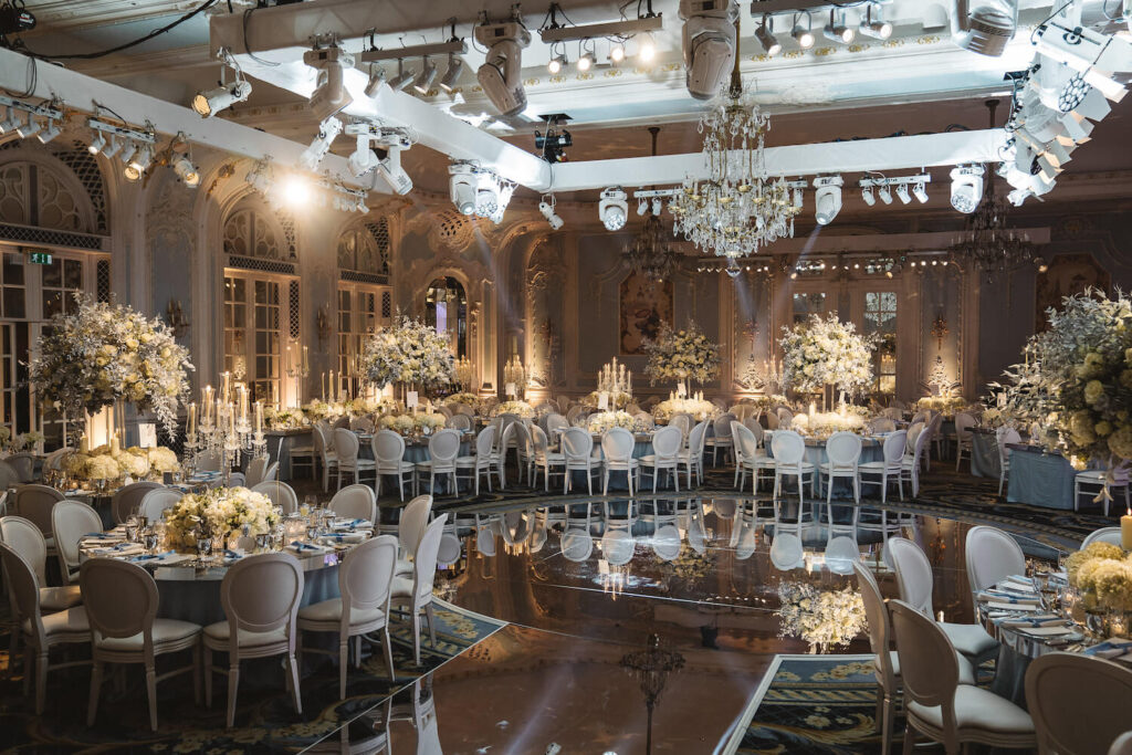 Hugely ornate and luxurious, the ballroom at The Savoy Hotel has become synonymous with aristocracy and the most lavish of celebrations. As such, the stage backdrop was designed and custom-built to emulate and replicate the panelling around the perimeter of the room. A large silver mirror dancefloor then added further dimension as white lighting fixtures blended seamlessly into the ceiling.