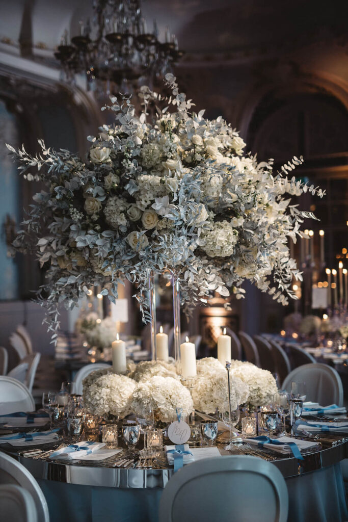 We set to work creating a dreamscape of winter white flowers, with silver mirror accents to correlate perfectly against the ornate interior decoration of the legendary Savoy ballroom.