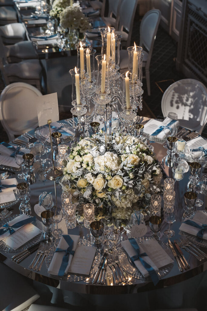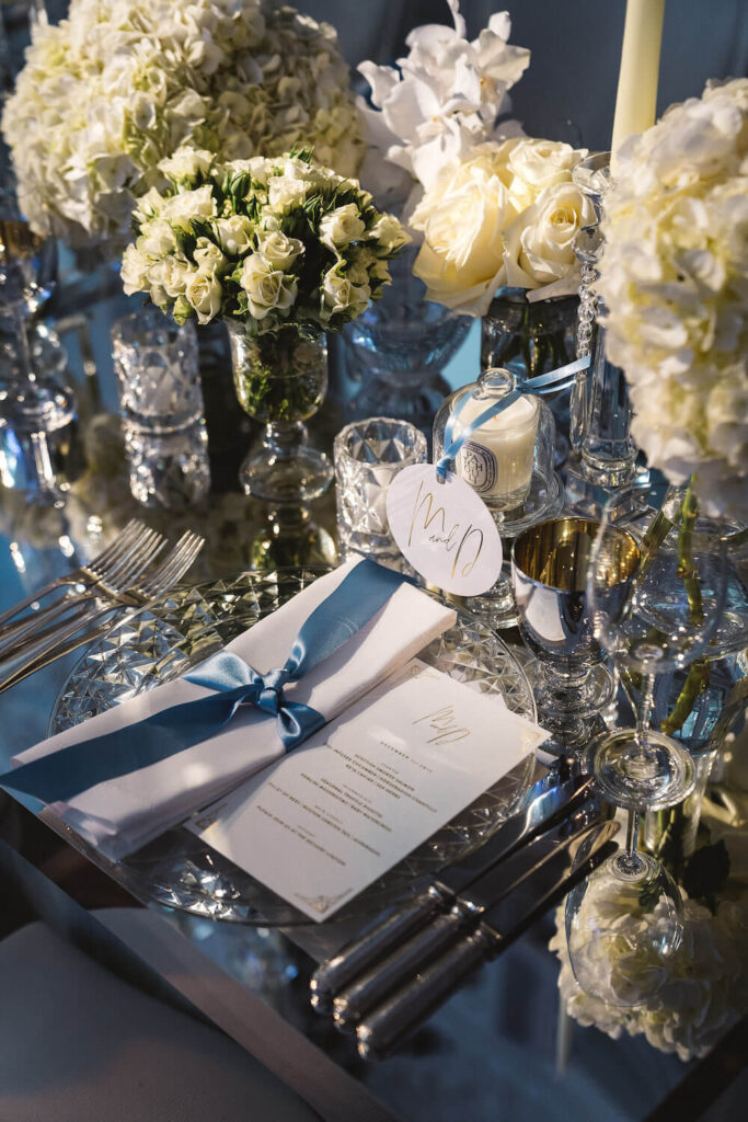 As wedding designers, we consider each detail of an Arab wedding to make sure that your guests have the finest experience. Diptyque candles were added individual glass cloches and soft blue ribbons which matched the wall colour of the Savoy Hotel Ballroom were added to each place setting.