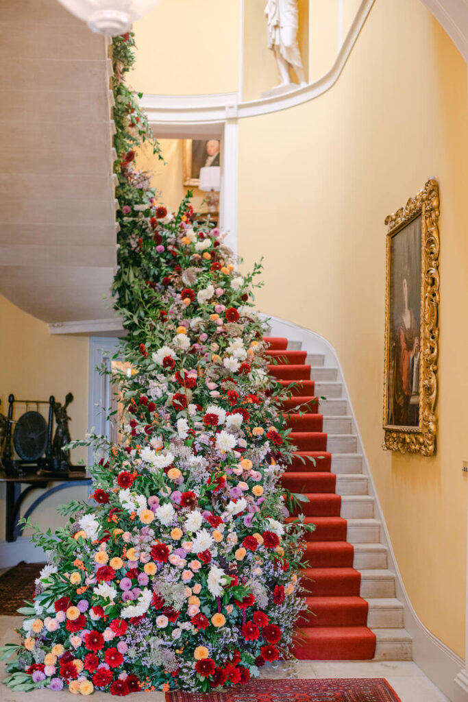 Using rich and romantic red flowers, lashings of British foliage and a whole host of English dahlias, we conjured up a hugely impactful and colourful floral scheme.