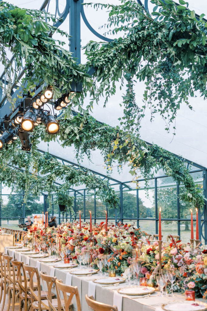 A decadent floral arrangement tumbled down the stairs within Sibton Park to welcome guests and offer the most beautiful photo opportunity. This gave guests a hint of what would follow but no one could have imagined how we would have transformed The Orangery into a magical and enchanted garden.