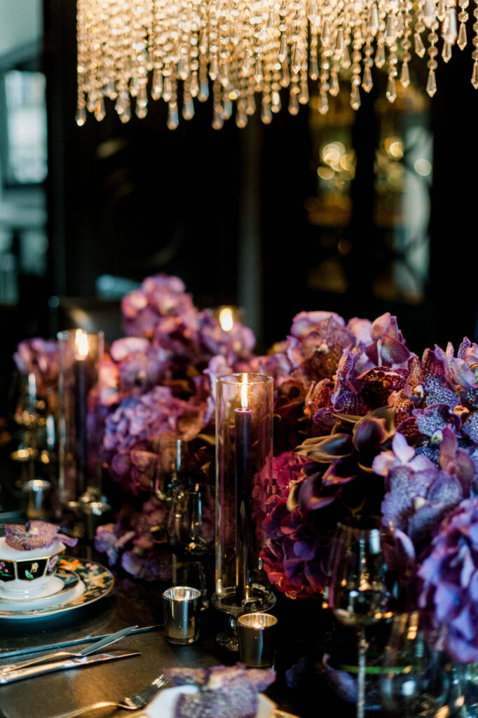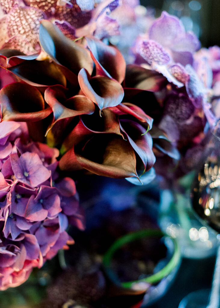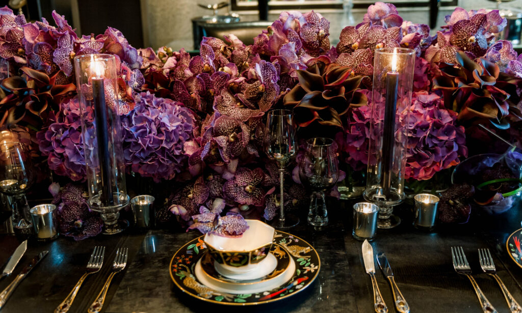 Running along the centre of their bespoke dining table, a hugely luxurious and impressive design formed using hydrangea, vanda orchids and calla lilies. Designing in a contemporary manner, flower arrangements undulated throughout in a molecular formation to offer a unforgettable final result. Grouping individual flower varieties together creates a more modern and sculptural look and chic black candles then added the perfect finishing touch.