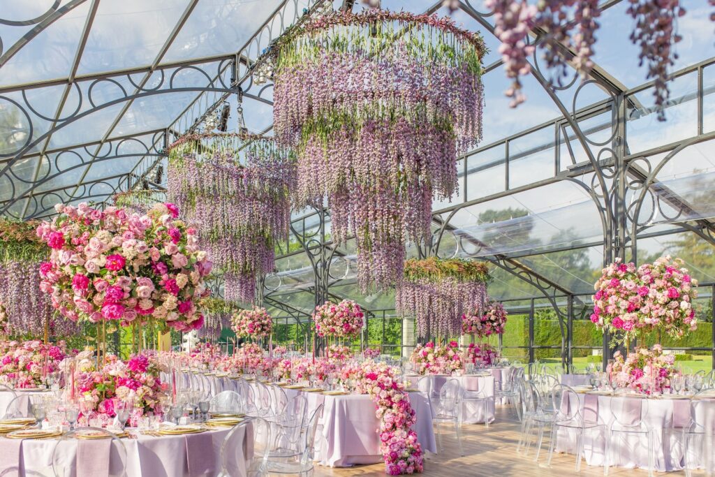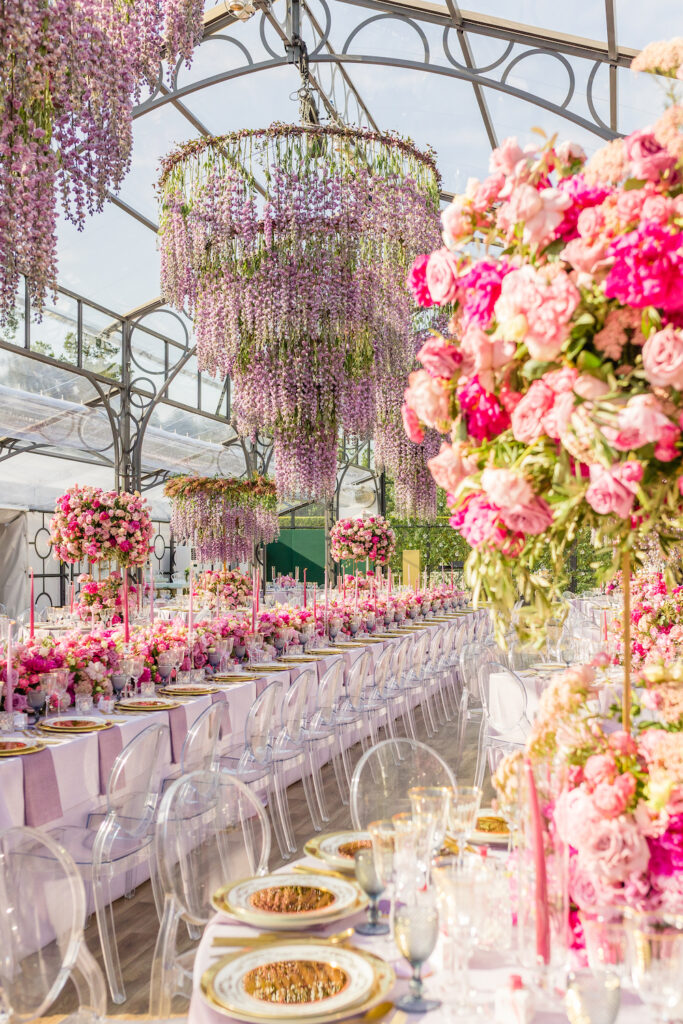 The transformation inside the glass orangery marquee was nothing short of spectacular.  Giant fresh floral chandeliers hung from the centre of the ornate structure to create the most jaw-dropping visual feast for the eyes.  Large floral trees stood on round dining tables alongside large asymmetrical flower arrangements featuring thousands upon thousands of fresh roses in a palette that explored textures of pink.
