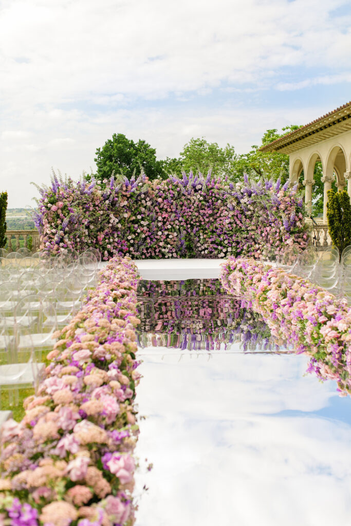Outdoors on the rear terrace, the ceremony quite simply took your breath away.  A giant floral wall created using all the brides favourite lilac flowers with floral meadows on either side of the silver mirror aisle, guiding you along the most memorable walk of your life.