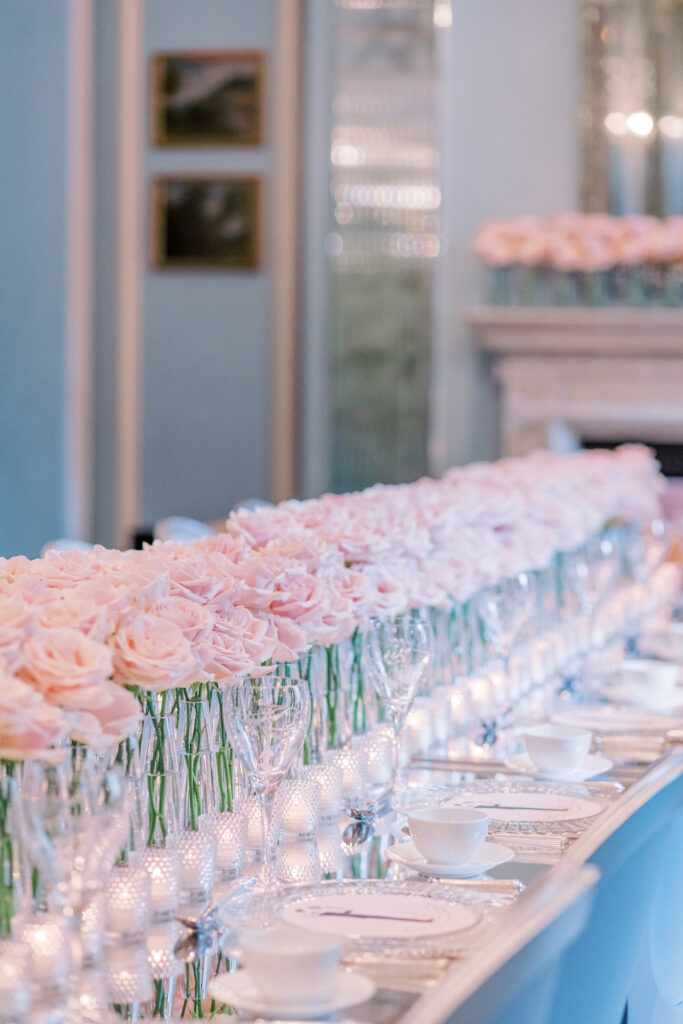 Using thousands of the most beautiful sweet avalanche roses from premier rose grower, Meijer, we created a modern floral arrangement, perfect for a luxury wedding brunch. Running along the centre of one long dining table in the exquisite Belgravia Room at The Lanesborough Hotel, London, chic clear glass vases in perfect rows offered a clean floral arrangement. Hundreds of candles lined a mirror top table that referenced the silver mirror detailing in the ornate room at The Lanesborough Hotel.
