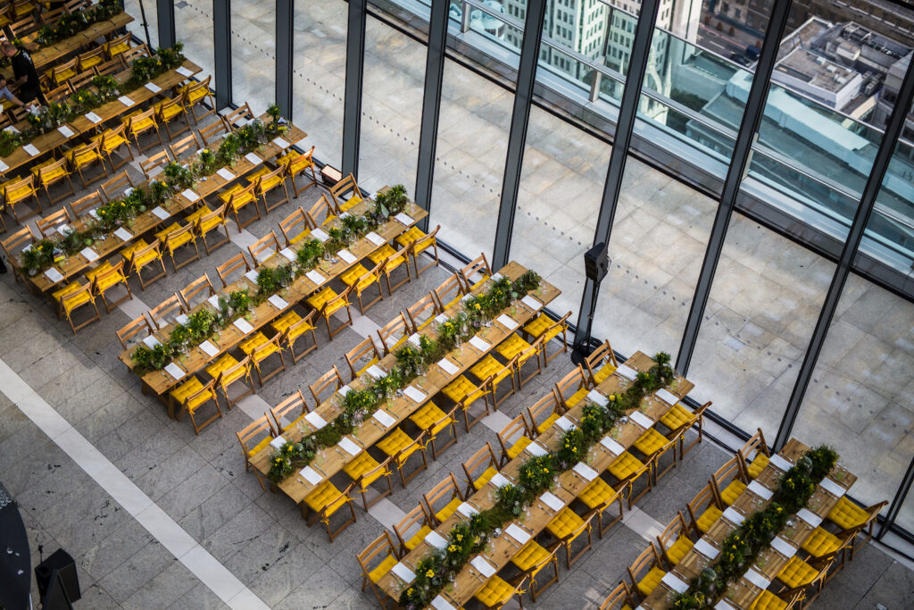 Long wooden dining tables, accented with yellow seat cushions incorporated the clients brand colours in an imaginative and subtle way. Yellow was also incorporated within the flower arrangements and overall floral scheme alongside spring greens, organic mosses and spring planting.