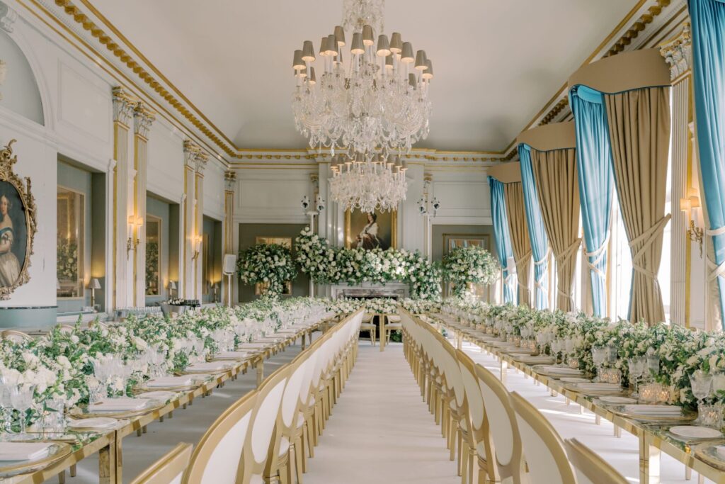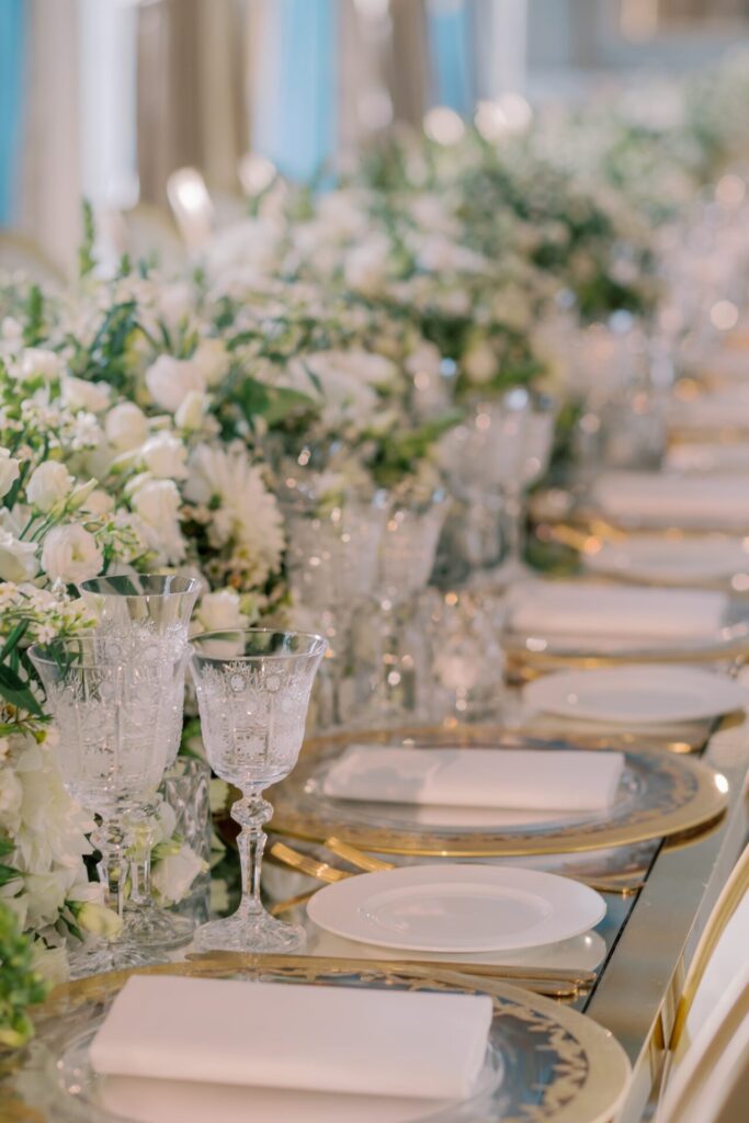 The wedding breakfast, hosted in the Cliveden Dining Room was transformed with a white carpet before chic golden tables with silver mirror table tops were added. White wedding florals ran along the centre of the tables and created the most understated yet impactful setting. Contemporary flatware, crystal candle accessories and gold cutlery were all combined to offer a timeless yet luxurious wedding design.