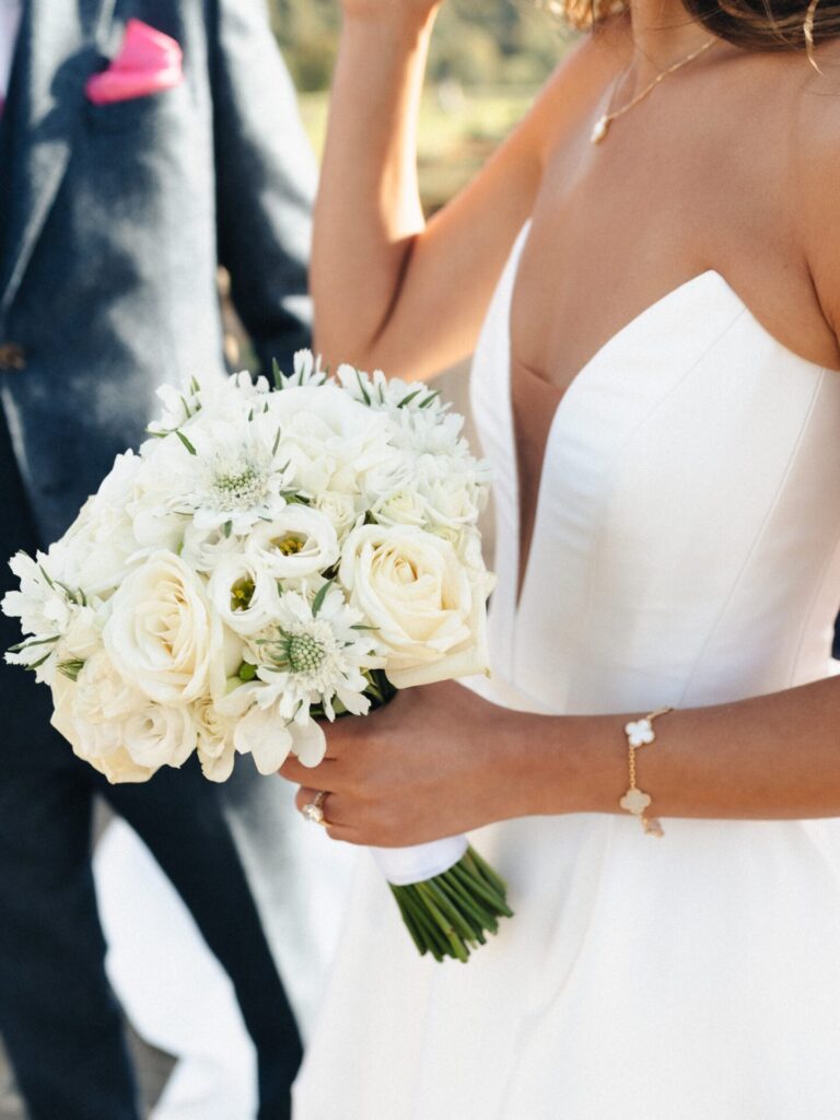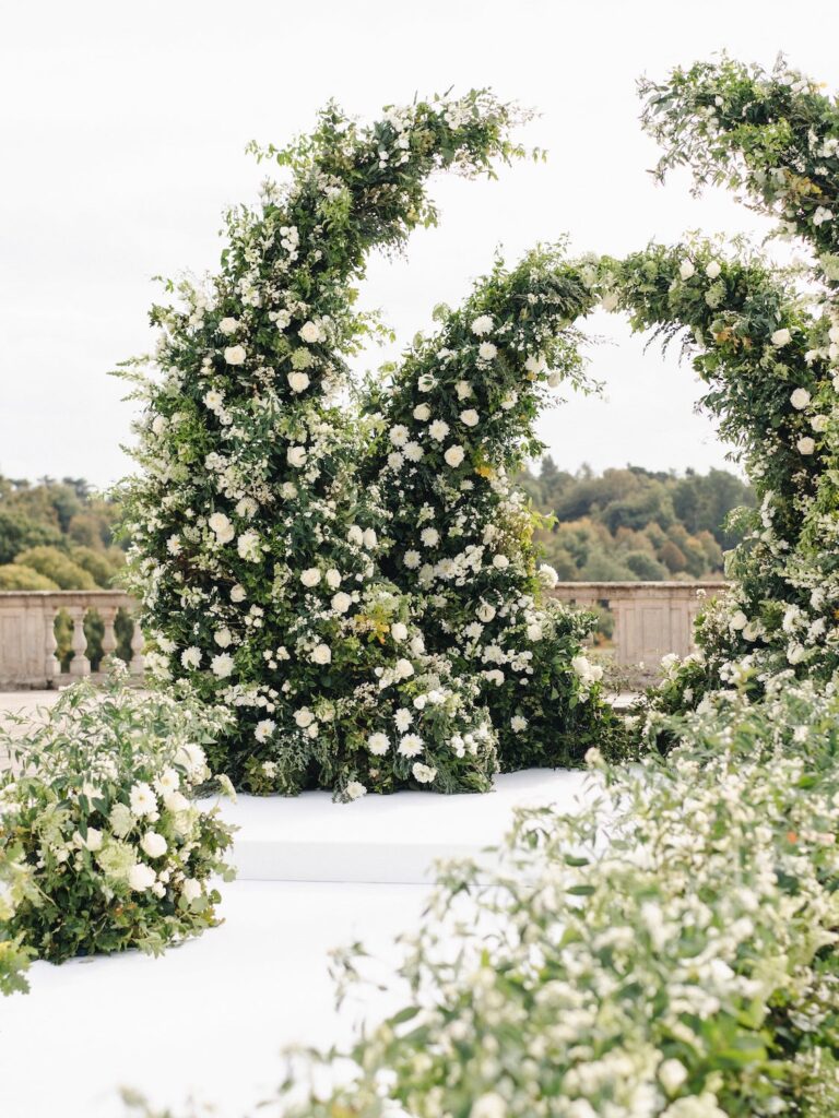 Working with revered wedding planner Kristina Kempton, we imagined the most beautiful double moongate ceremony design using large custom-created rings filled with English greens and the most luxurious white wedding flowers. Running along the aisle on either side, floral meadows, expressive by nature and hugely impactful ensured the final finish was totally unforgettable. Rich in detail, we used a romantic combination of white wedding flowers including dahlias, white avalanche roses, euphorbia and ammi. Overlooking the incredible parterre gardens at Cliveden House, this ceremony really had the perfect backdrop for the most unforgettable wedding celebration.