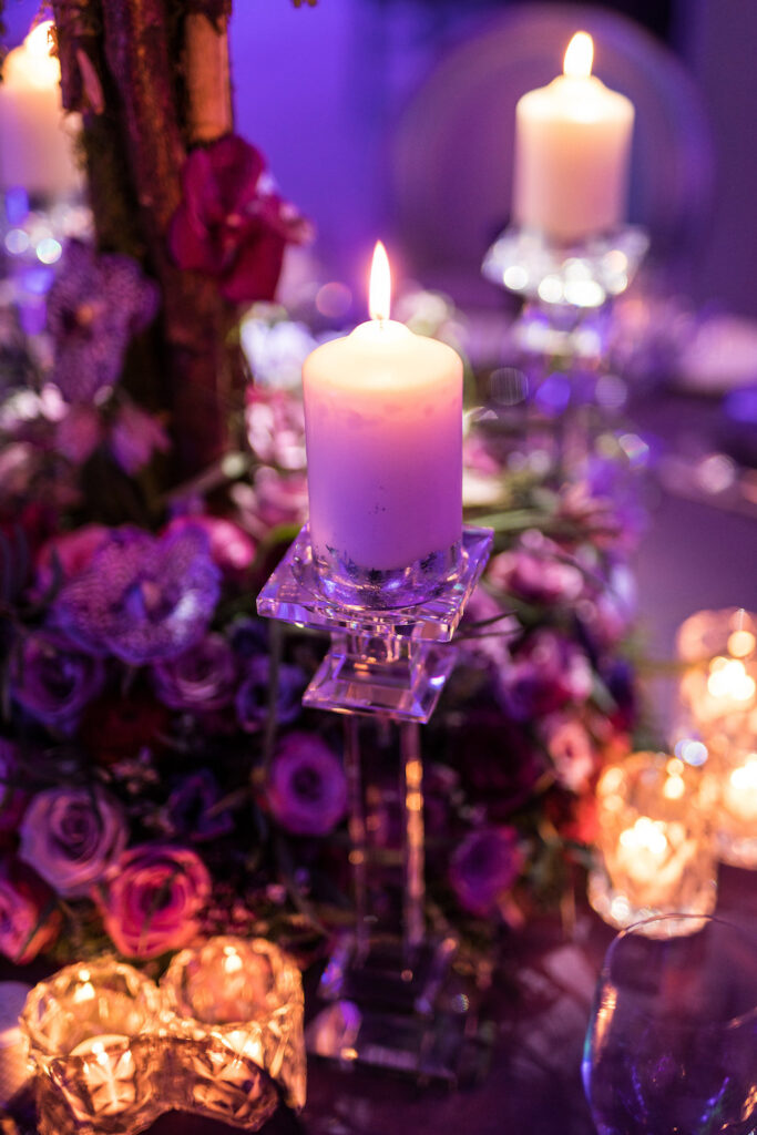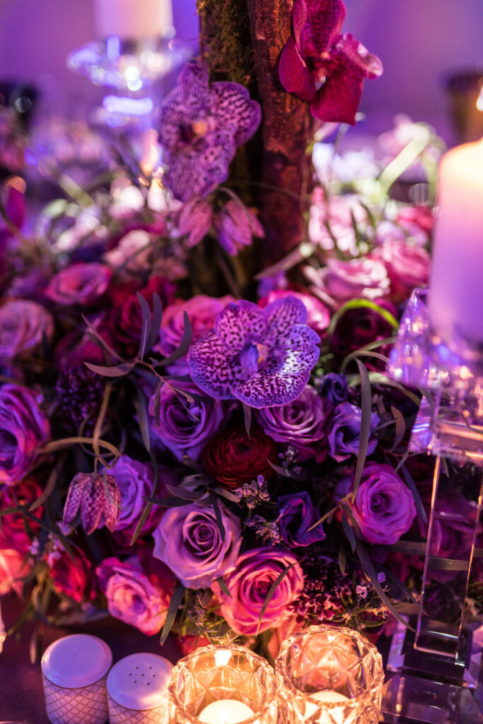 Large and luxurious freestanding trees stood atop dining tables, each with a canopy created using hand painted ultraviolet foliage. Roses and vanda orchids in a palette of deep berry and purple tones smothered the base of the table to create the most beautiful dining experience. Crystal accessories were then added to each table scheme to cast a soft, warm glow throughout the dining area. Hidden in the alcove of the Riverside Rooms at The Savoy London, the perfect selfie moment; a tree swing with overgrown meadows where guests could perch to snap a memory of this very special birthday party!