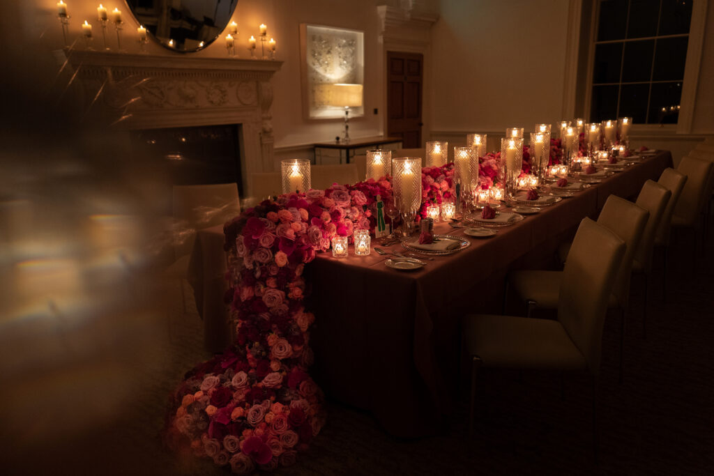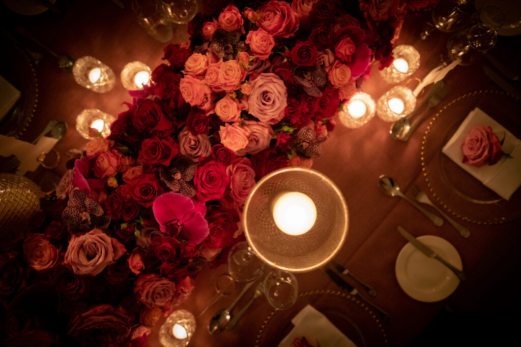 An opulent and hugely luxurious continuous runner of flowers ran along the centre of the dining table. Crafted using the most beautiful roses, spray roses and vanda orchids in a palette of deep, jewel tones this warm scheme ensured guests would feel at home whilst creating a true sense of occasion. Cut crystal accessories ran on either side to add a further layer of luxury before the florals spilled off the edge of the table and tumbled to the floor below on either side in the most theatrical manner. Every detail in this intimate surprise birthday celebration was carefully curated to ensure guests had the most unforgettable experience.
