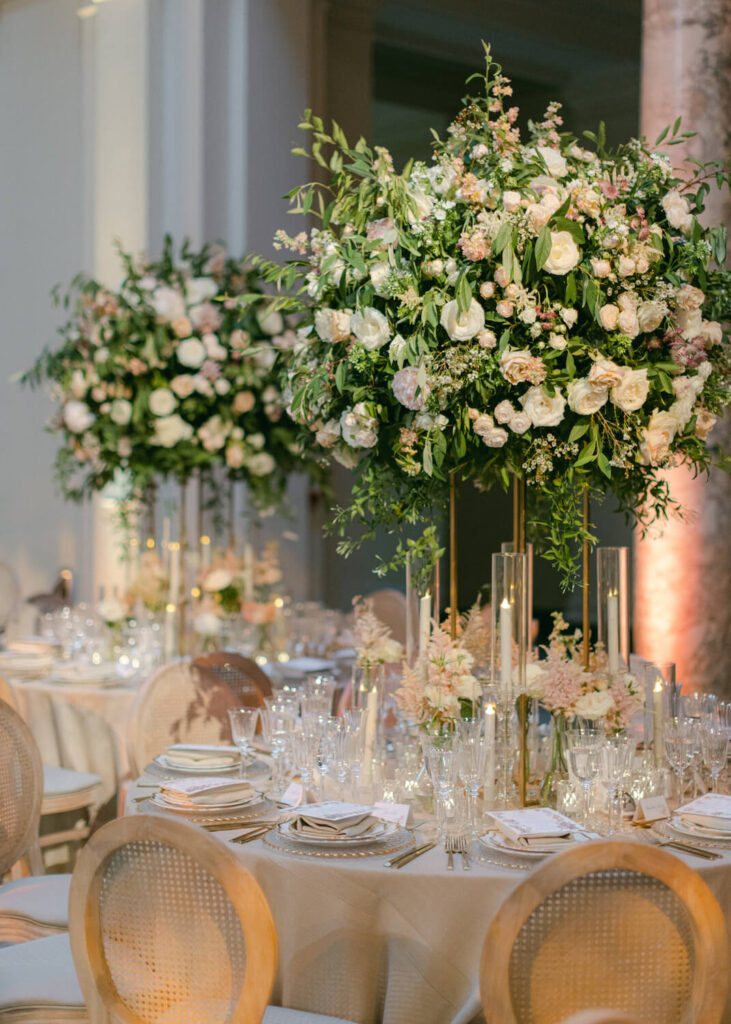 To create a timeless and elegant summer wedding scheme that would sit harmoniously in the iconic Victoria & Albert museum. The bride, a renowned interior designer, adored blush pink and white flowers and wanted to create a wedding which would stand the test of time. In 20 years, she wanted to be able to look back at her photos and feel the wedding could still have only just taken place.