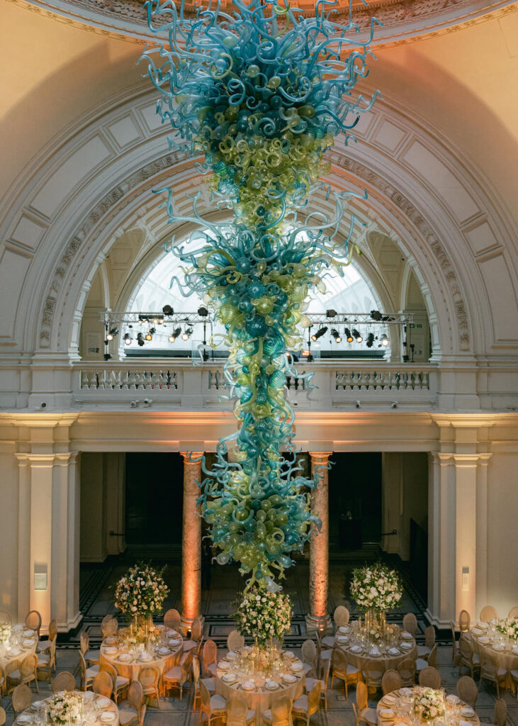 Within the Dome at the Victoria & Albert Museum in London we created the most elegant and luxurious flower arrangements. Inspired by the English countrywide, each tall flower arrangement had lashings of British foliage alongside flowers in blush pink, vintage pink and nude tones. The after party continued in the Dome as guests danced and celebrated together beneath the iconic Chihuly installation.