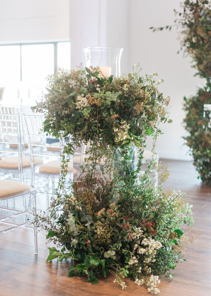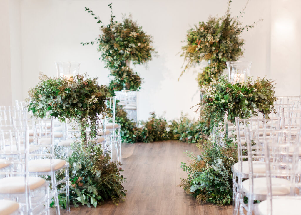 Flanking the aisle, hurricane candles, nestled by English greenery and flowering foliage. Pairing this use of greenery against modern clear chairs and the contemporary, white venue ensured a dramatic look that oozed elegance and style.
