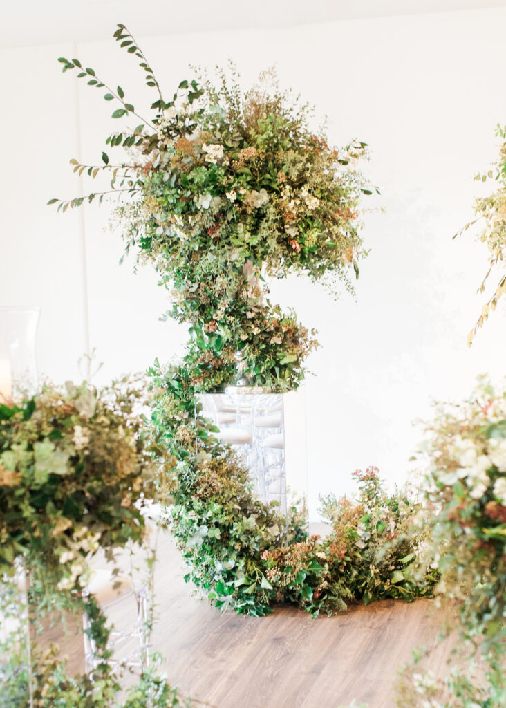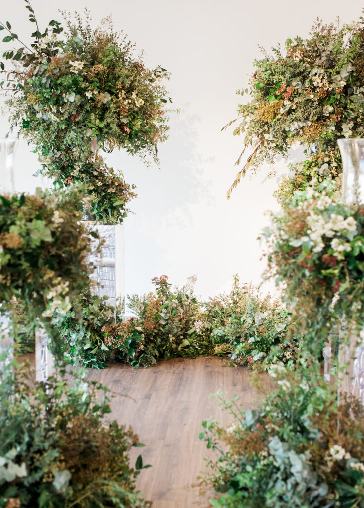 Our talented team of London florists created a wedding ceremony design that exuded texture, movement and detail. Softening this blank canvas venue in The OXO Tower, we worked with flowering foliages and lashings of English greens to offer a truly romantic yet understated look.