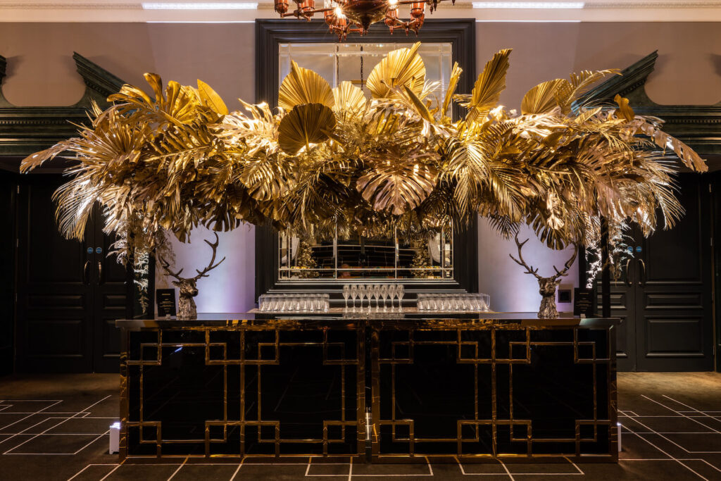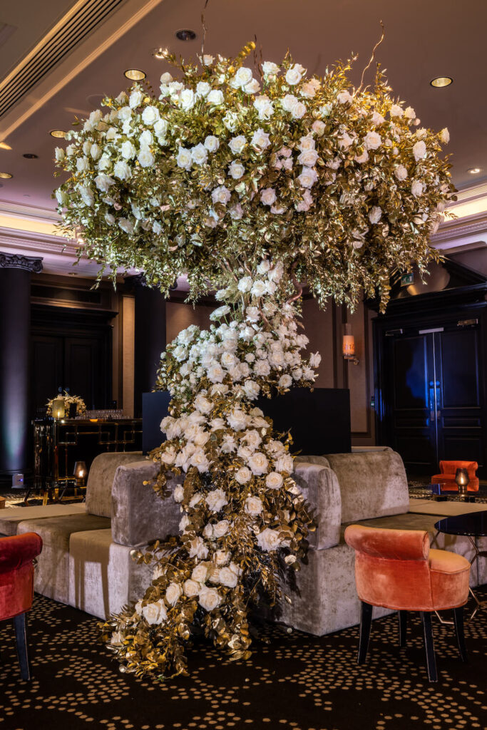 As guests moved beyond the gold flower cocktail bar, they entered into a custom-built nightclub, rich with velvet textures, marble, chic lighting and impressive floral designs. Giant floral trees made using gold and white flowers cascaded over lounge furniture to add theatrical flair.