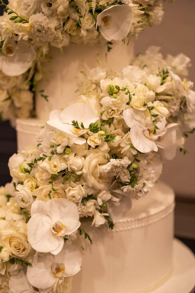 With a hint of the traditional, a large and luxurious wedding cake took centre stage. This was adorned with a white floral cascade design; perfect for photographs and late night snacks!