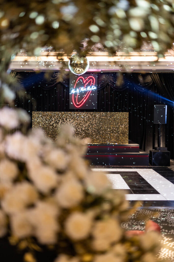 A Black and white dancefloor, giant mirror ball and custom-built DJ booth then offered a space for guests to party the night away. Oh, and no wedding party would be complete without a custom-built neon sign behind the DJ!
