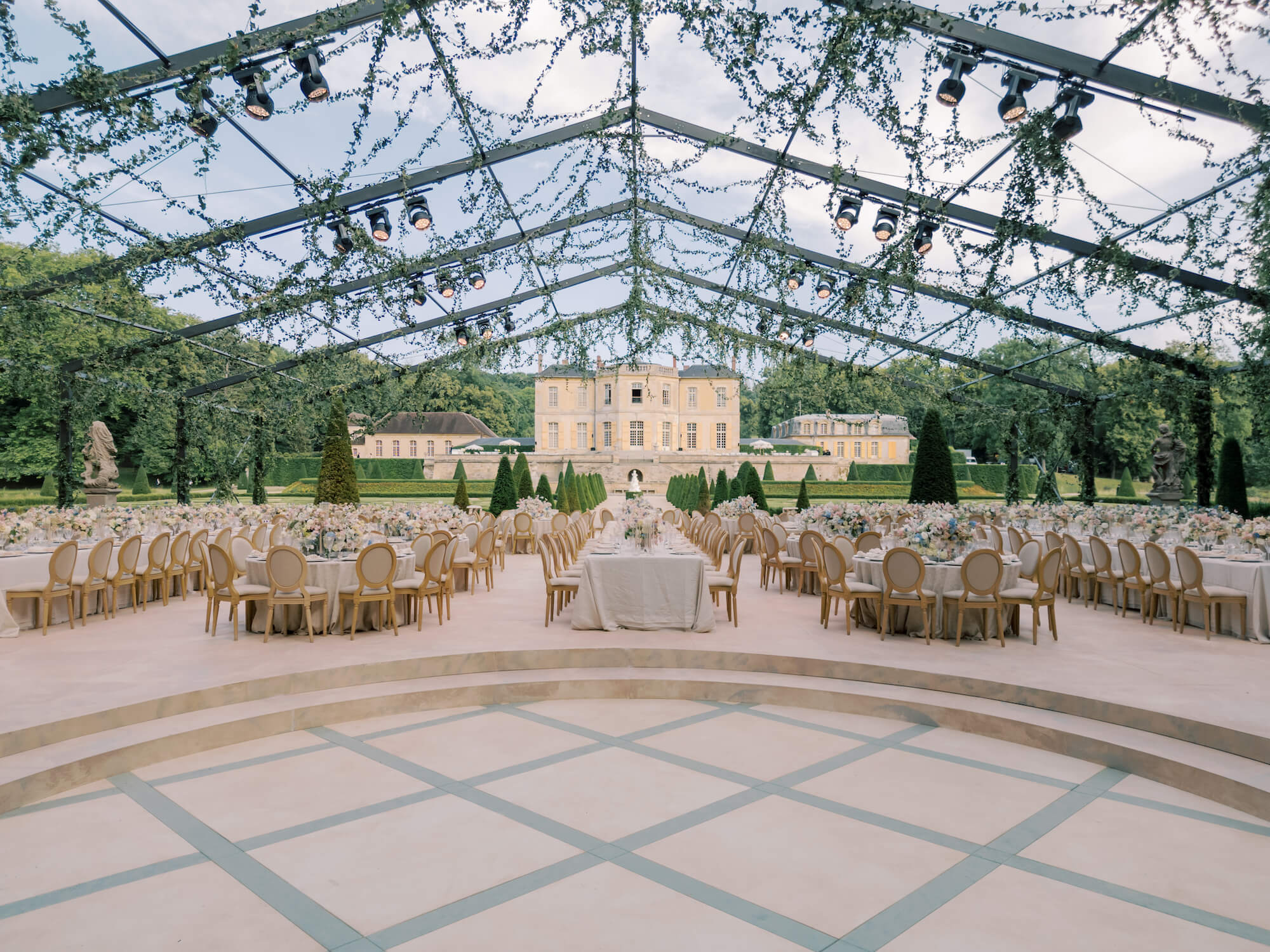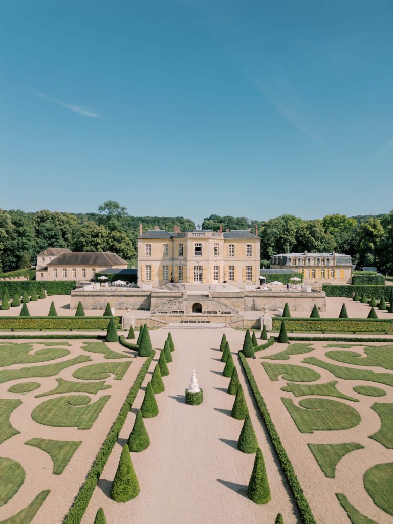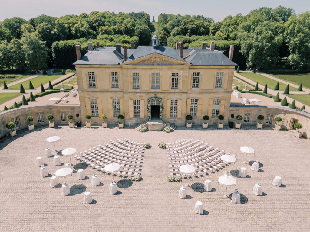 Larry Walshe transformed the storied Château du Villette into a vision of refined French romance for a Parisian wedding. Drawing inspiration from the estate’s grand symmetry and classical architecture, the ceremony unfolded in the château’s cobbled courtyard, where rows of elegant ivory chairs were arranged in sweeping arcs to mirror the building’s stately façade.