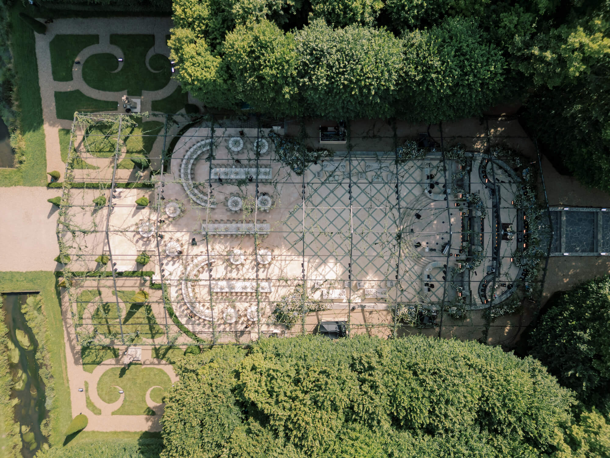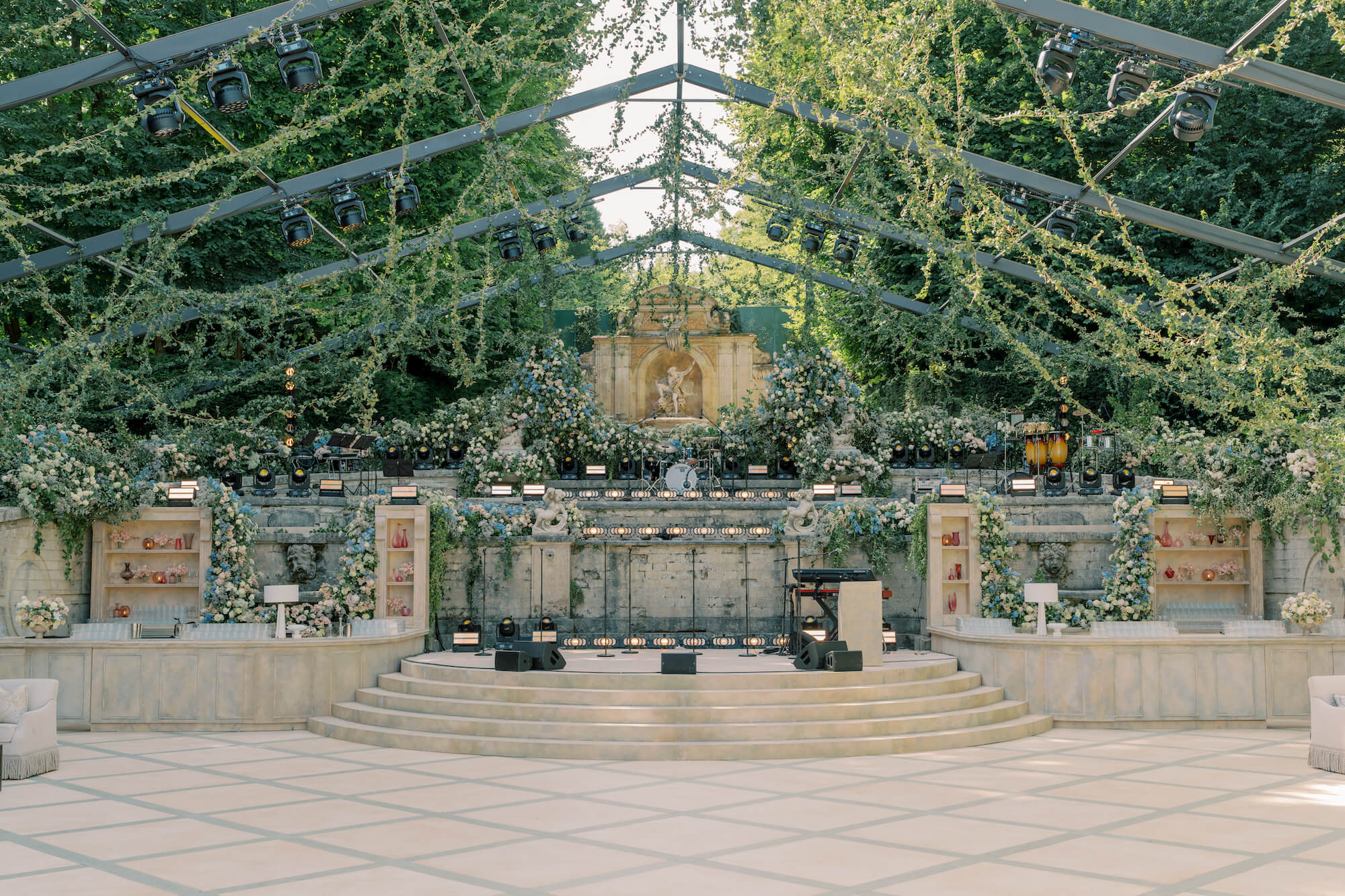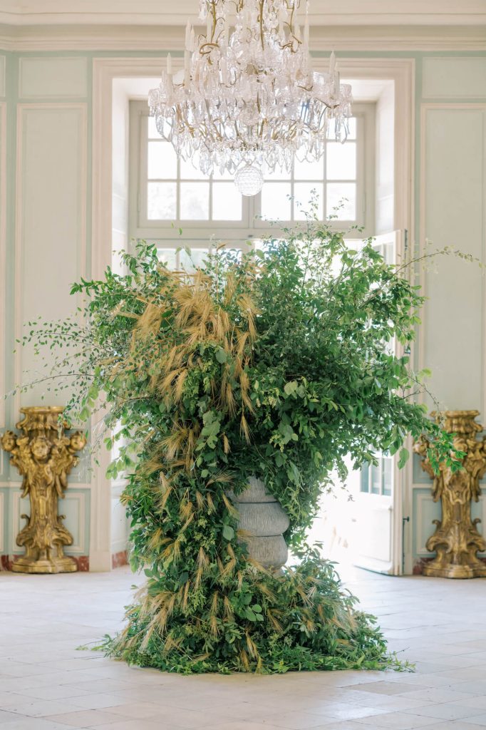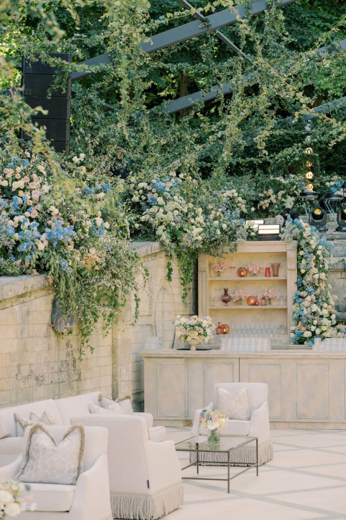 For the reception, Walshe reimagined the château’s garden amphitheatre beneath a canopy of cascading greenery. Overhead, layers of foliage and trailing vines were suspended to create an immersive, enchanted atmosphere, blurring the line between architecture and nature.