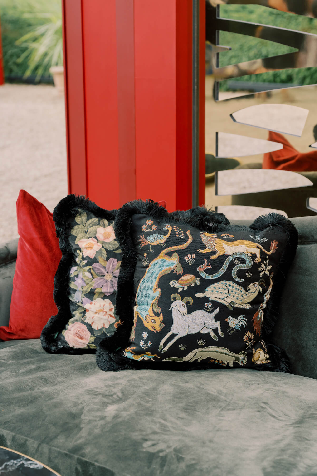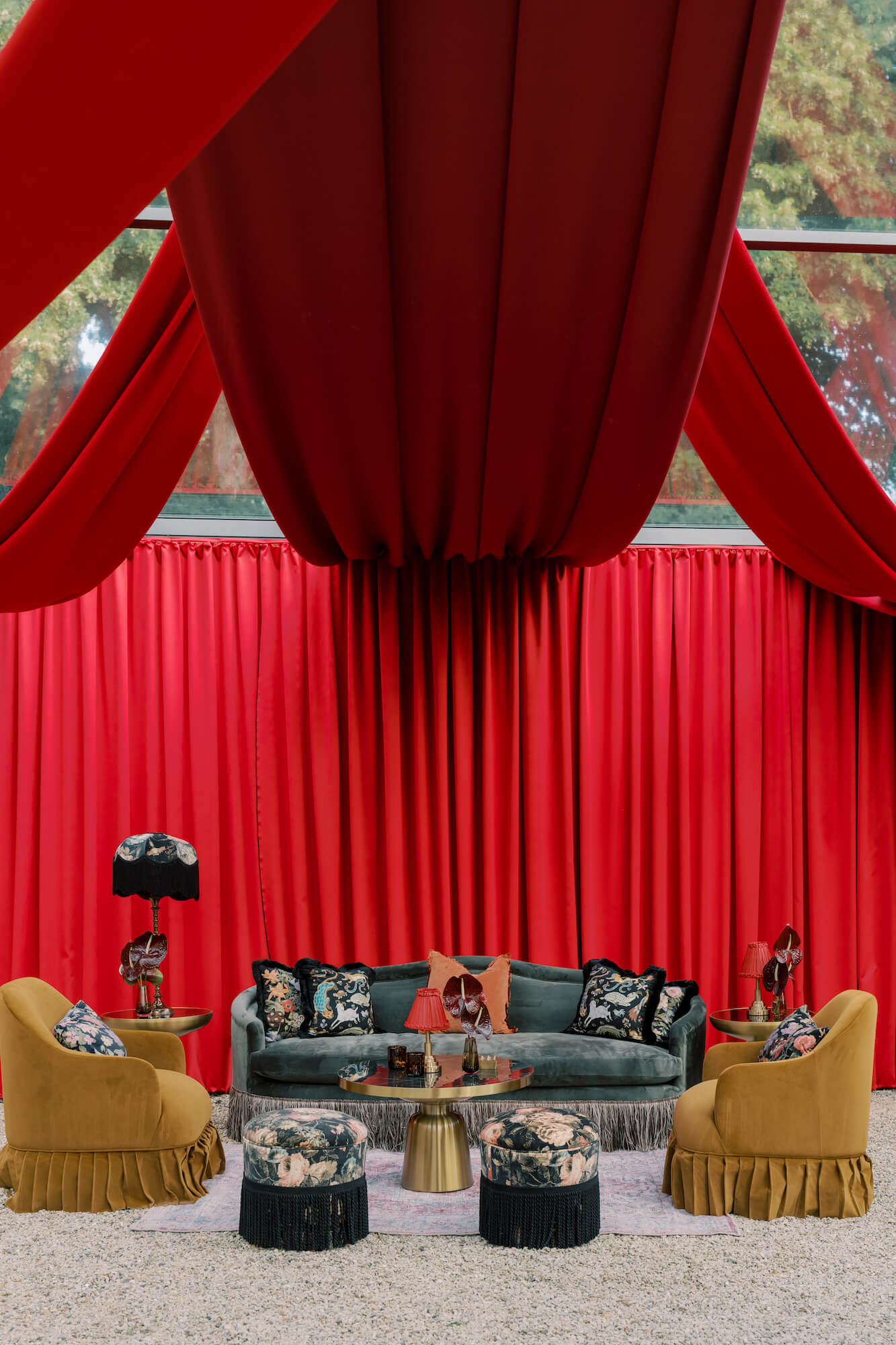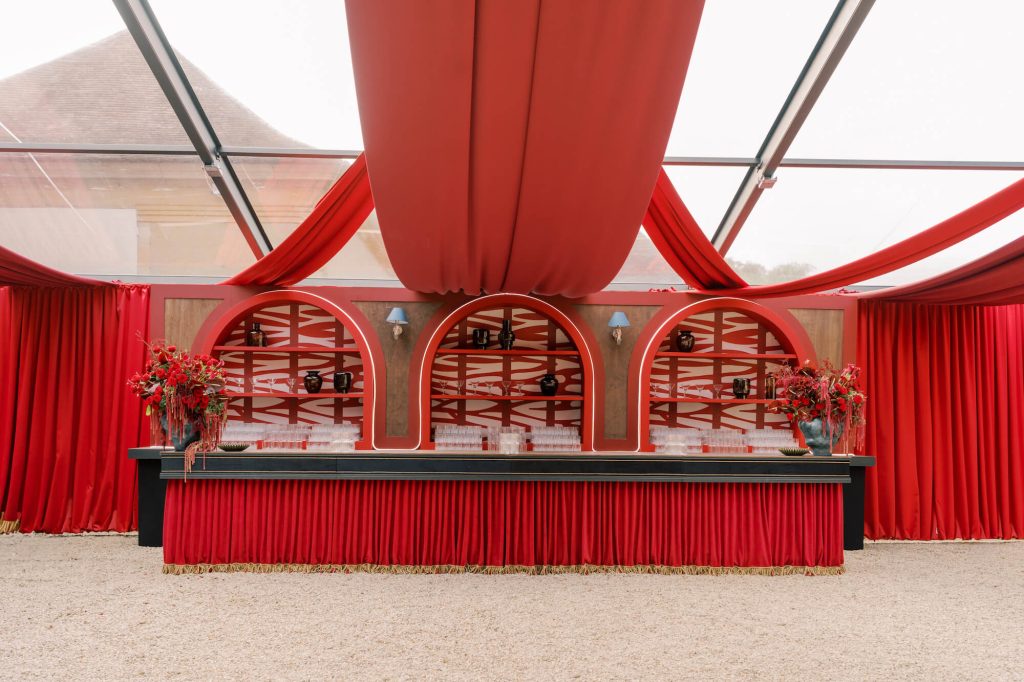 For the reception, Walshe reimagined the château’s garden amphitheatre beneath a canopy of cascading greenery. Overhead, layers of foliage and trailing vines were suspended to create an immersive, enchanted atmosphere, blurring the line between architecture and nature.