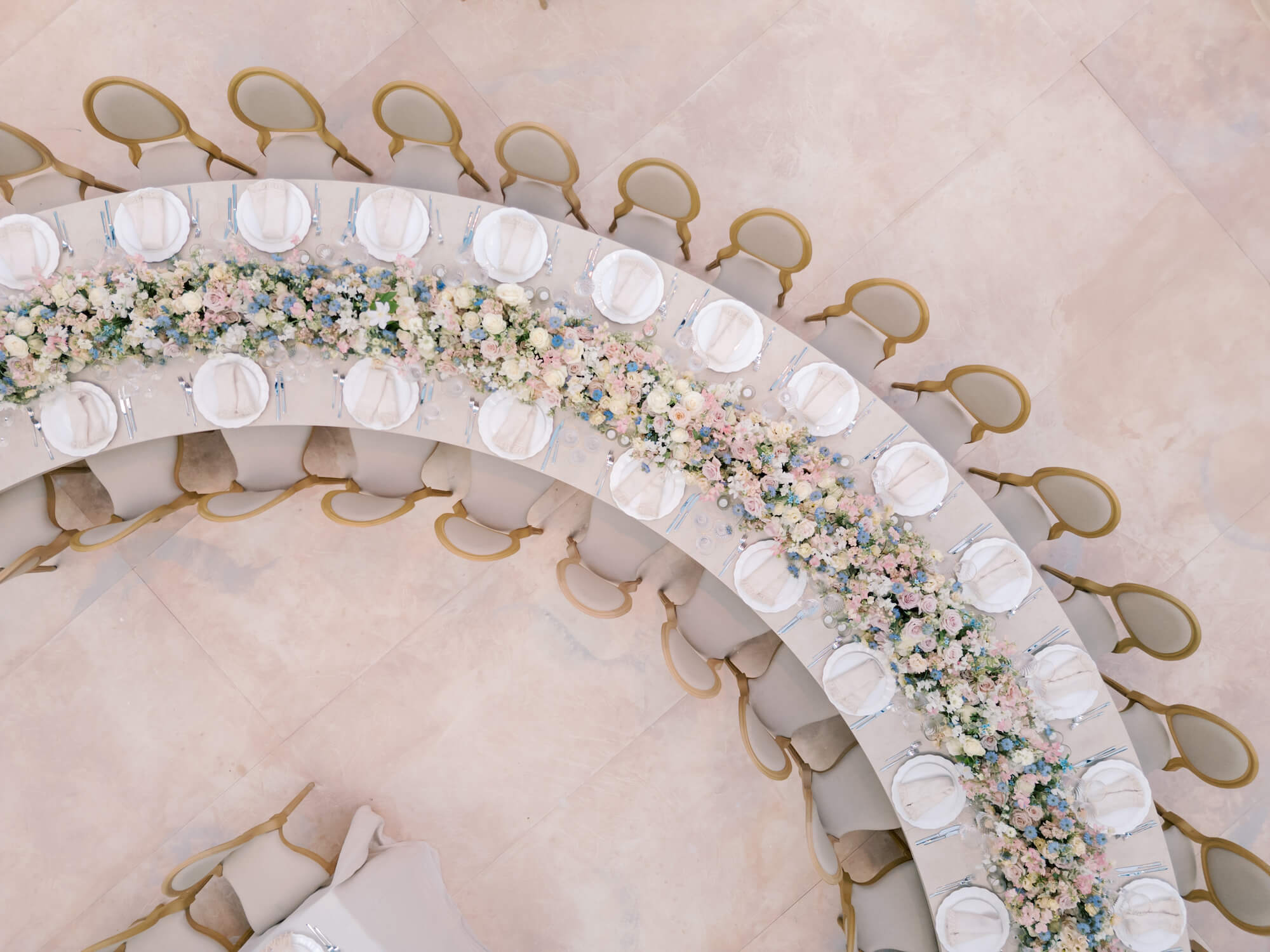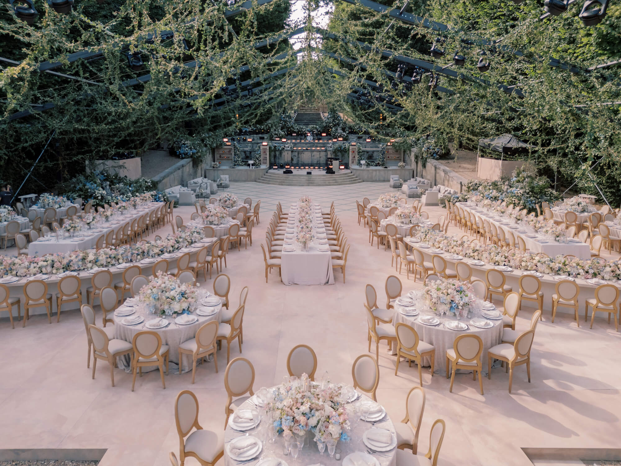 Long banquet tables and intimate rounds were dressed in fine linens and adorned with abundant pastel floral compositions in blush, powder blue, and ivory, echoing the romance of an 18th-century fête. The palette felt ethereal against the surrounding verdure, while candlelight and soft ambient lighting brought warmth to the dramatic setting as dusk fell, creating a dreamlike tableau.
