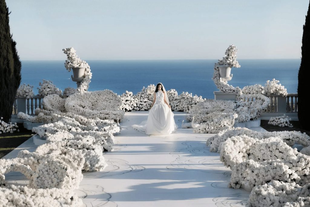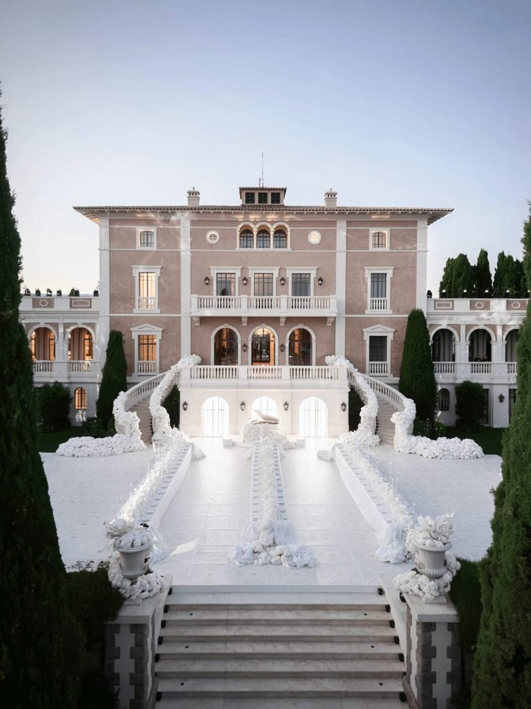 At the altar, classical stone urns overflowing with cascading white flowers framed the bride against the horizon, while the expansive floral arrangements appeared to grow organically from the ground, blurring the line between landscape and installation. The bride’s elegant gown, with its sculpted bodice and voluminous skirt, mirrored the purity and texture of the surrounding florals, reinforcing the monochromatic aesthetic. As the ceremony unfolded at sunset, the sky shifted through soft pastel tones, enhancing the ethereal atmosphere and highlighting the contemporary romance set within a historic Mediterranean setting.