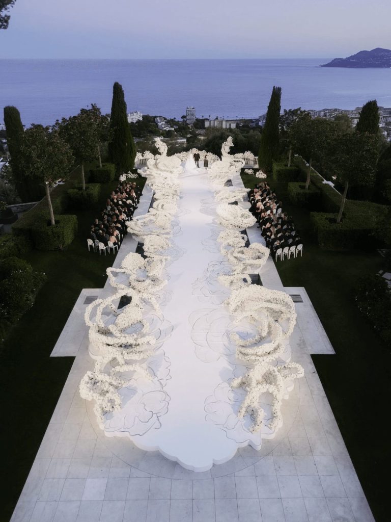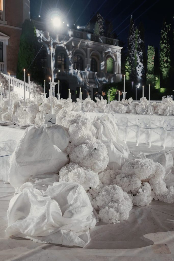 The team transformed the ceremony aisle into a living artwork, lining it with large-scale, fluid floral sculptures composed of thousands of white blooms. These organic forms echoed the movement of waves and clouds, creating a surreal garden installation that felt both modern and dreamlike.