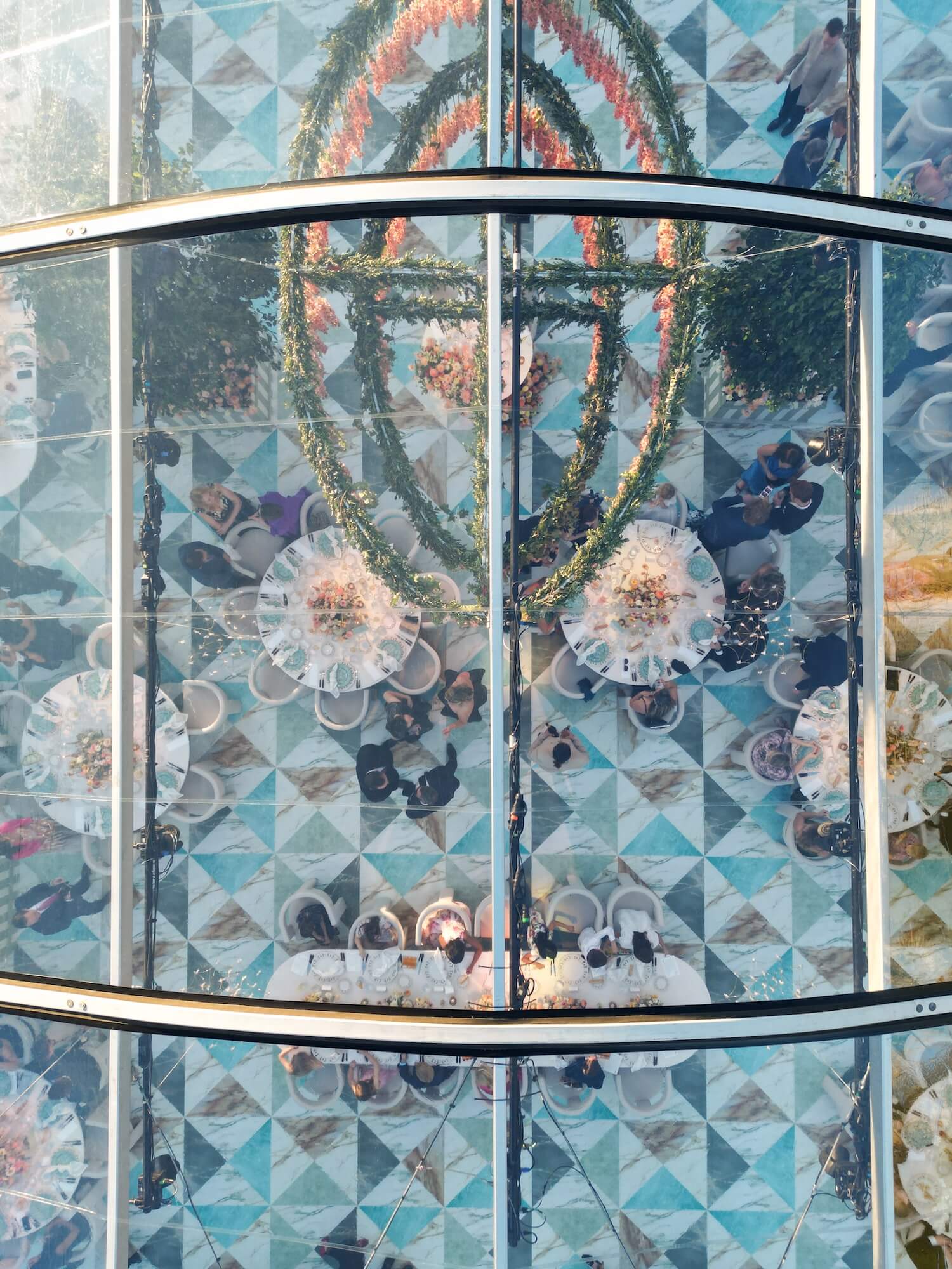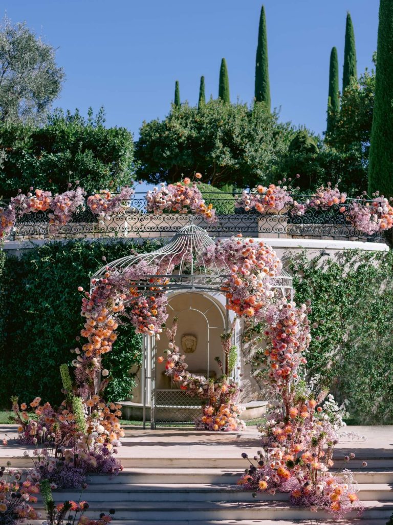 Dahlias, garden roses and airy meadow blooms were layered into sculptural installations that climbed the structure and cascaded down the steps, creating the feeling that the garden itself had blossomed into the architecture. Framed by cypress trees and climbing greenery, the setting felt both opulent and effortlessly natural, echoing the relaxed elegance of a Riviera summer.