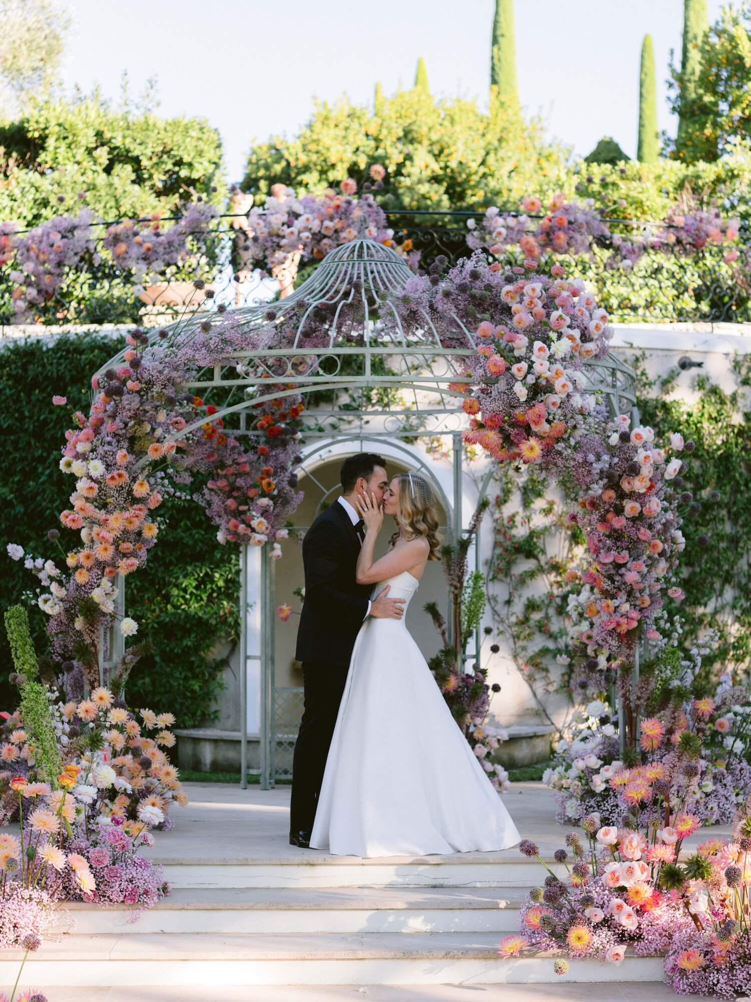 Set high above the Côte d’Azur, Château Saint-Martin in Nice provided an idyllic canvas for a wedding design by Larry Walshe that celebrated the romance of the French Riviera landscape. Inspired by the surrounding gardens and Mediterranean light, the ceremony unfolded beneath a delicate wrought-iron pavilion enveloped in an abundance of flowers in soft coral, peach, blush and buttercream tones.