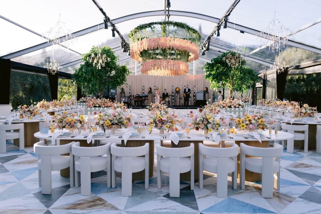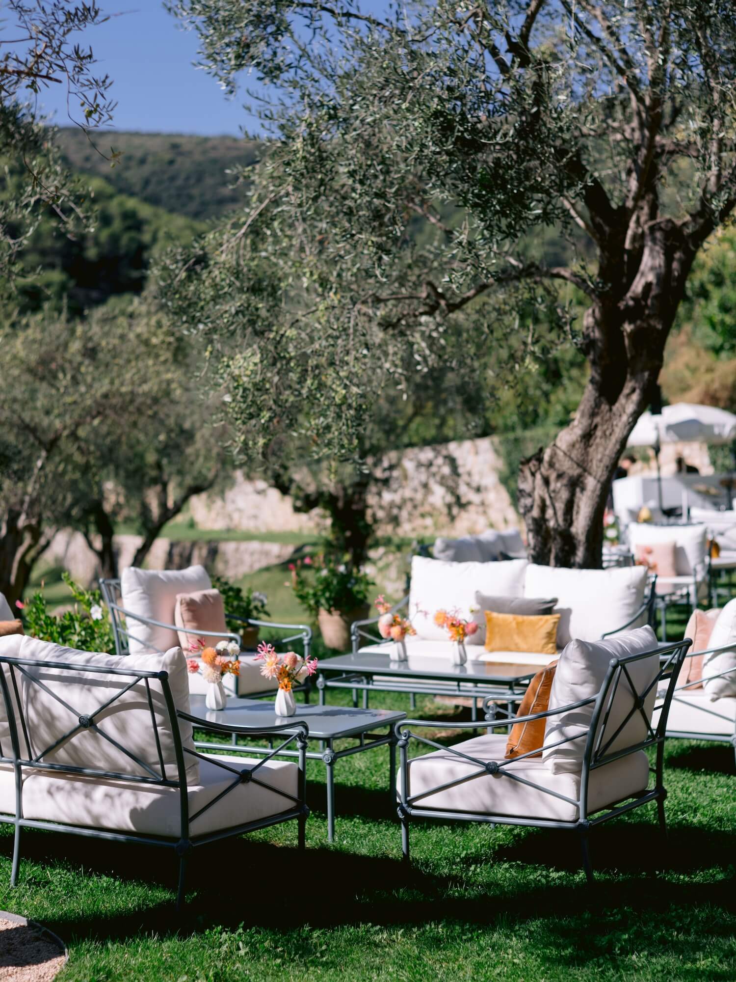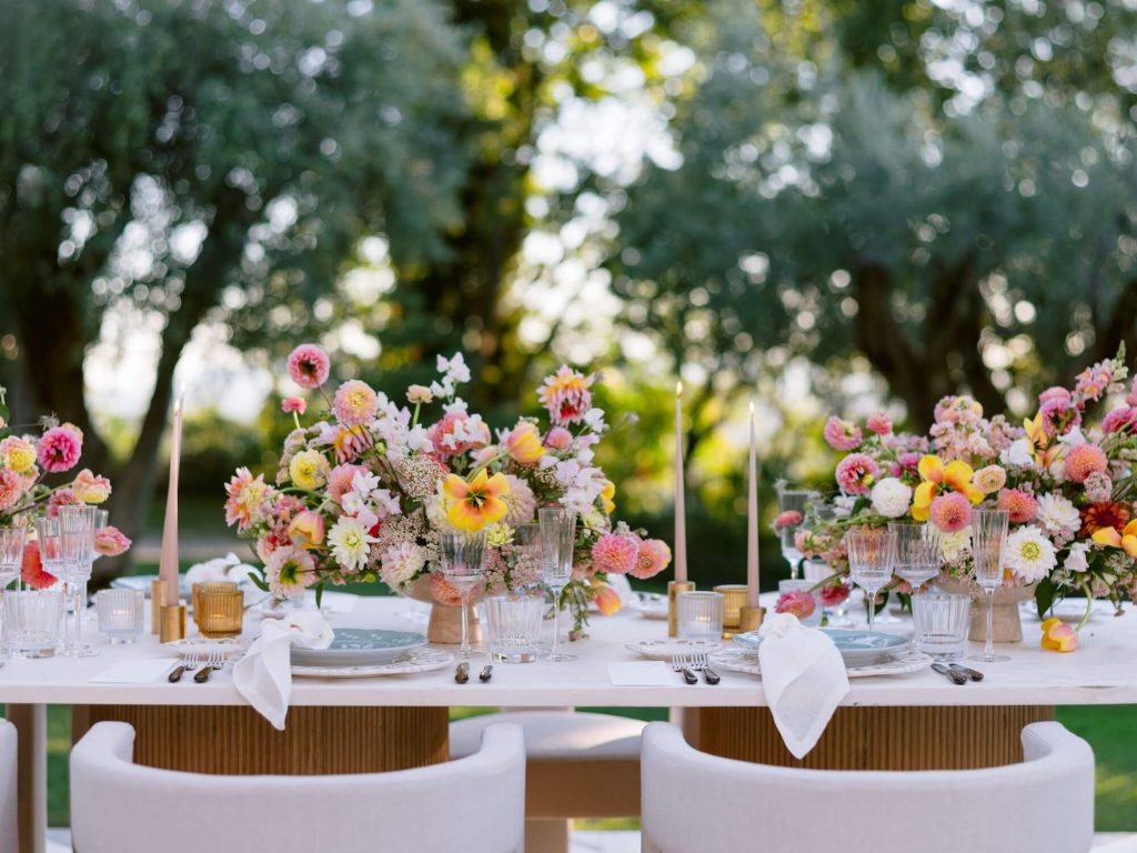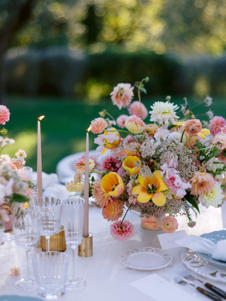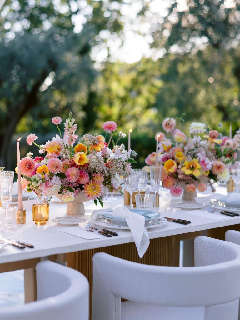 The design continued through the grounds with intimate outdoor lounges nestled beneath ancient olive trees, where guests gathered among soft neutral furnishings accented with delicate floral posies. Walshe’s floral direction leaned into a painterly palette reminiscent of Impressionist gardens, combining delicate dahlias, pansies, ranunculus and wild textures to create arrangements that felt abundant yet organic. Tables were dressed with crisp white linens, sculptural stone vessels and golden candlelight, while elegant porcelain and glassware added refined European charm. Each arrangement appeared as though freshly gathered from a blooming garden, reinforcing the sense of effortless luxury that defined the celebration.