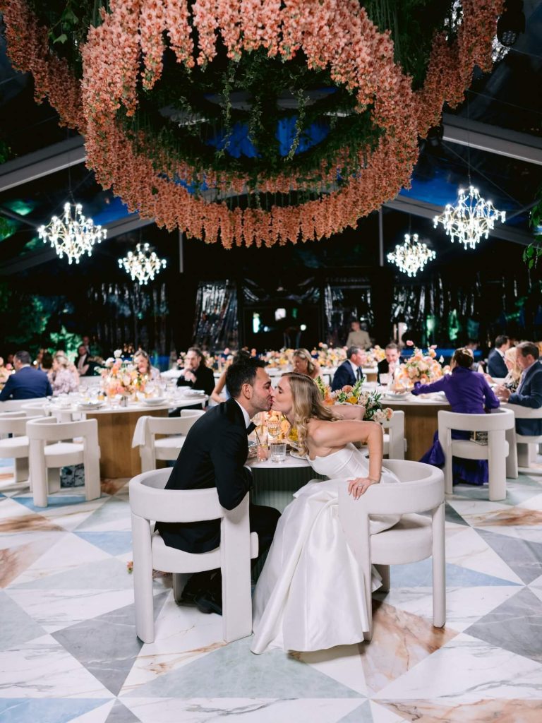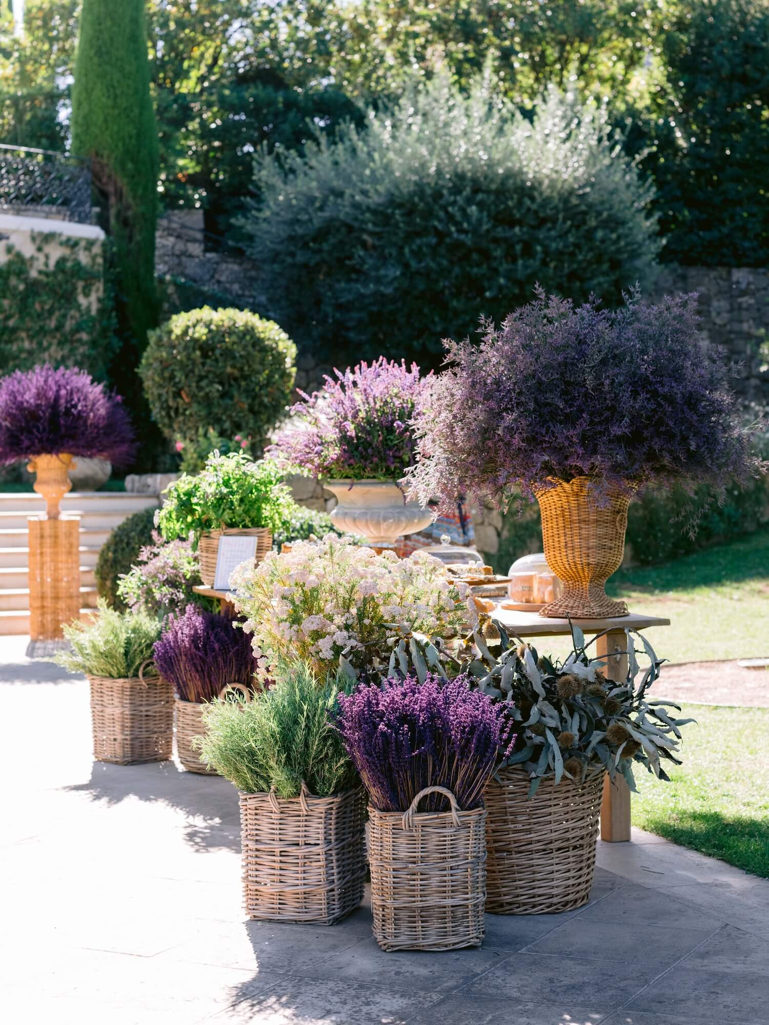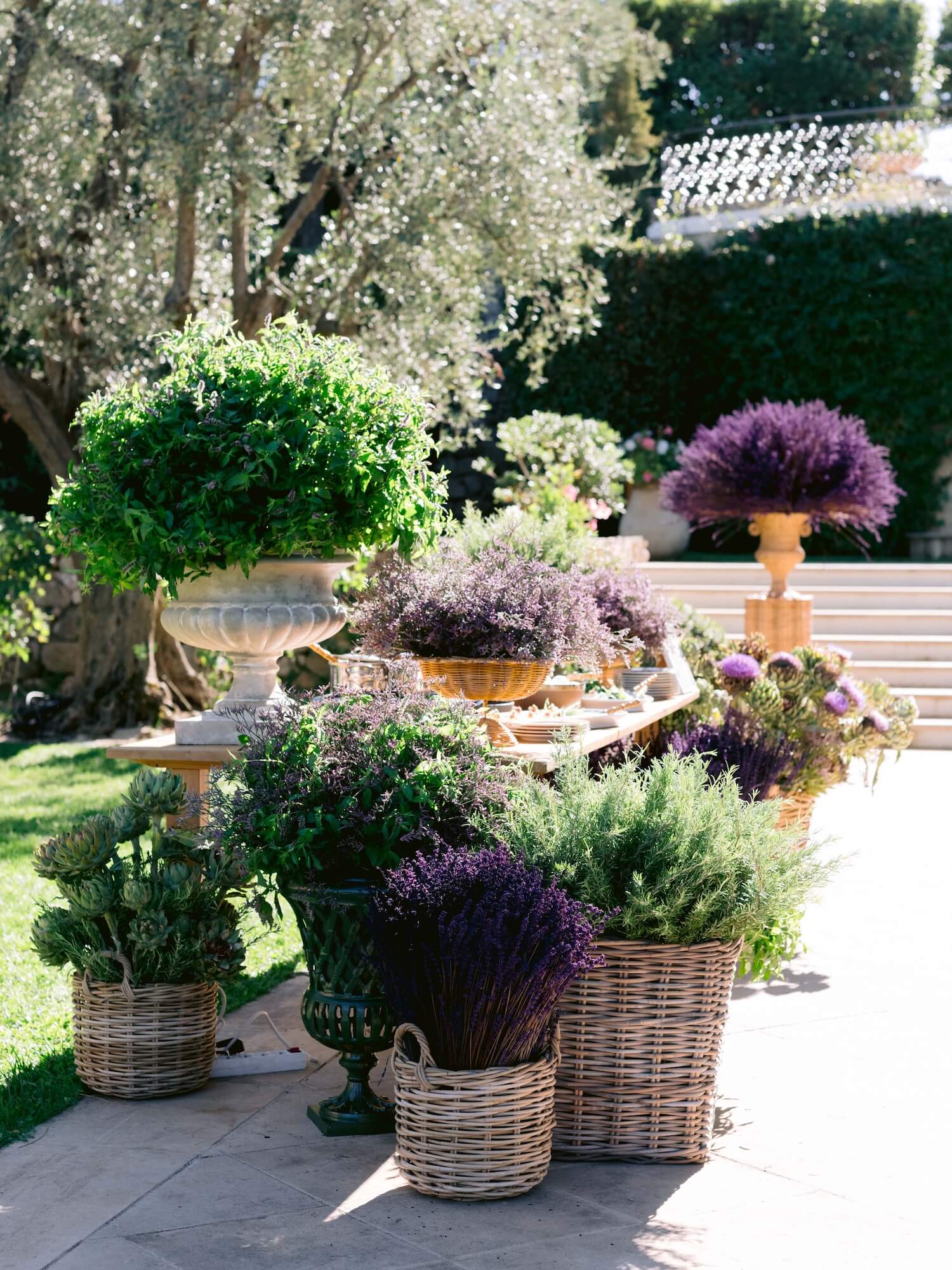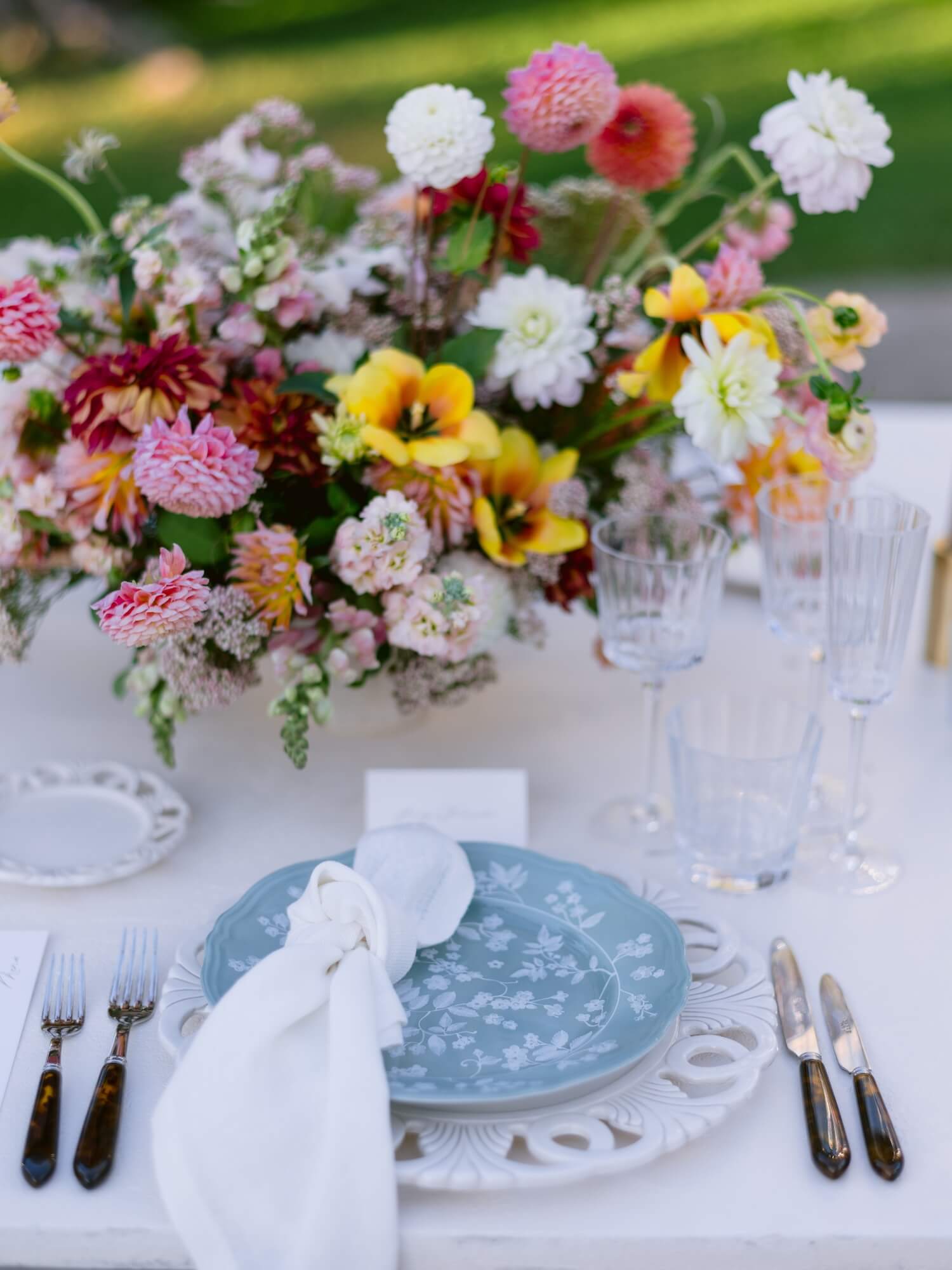 The design continued through the grounds with intimate outdoor lounges nestled beneath ancient olive trees, where guests gathered among soft neutral furnishings accented with delicate floral posies. Walshe’s floral direction leaned into a painterly palette reminiscent of Impressionist gardens, combining delicate dahlias, pansies, ranunculus and wild textures to create arrangements that felt abundant yet organic. Tables were dressed with crisp white linens, sculptural stone vessels and golden candlelight, while elegant porcelain and glassware added refined European charm. Each arrangement appeared as though freshly gathered from a blooming garden, reinforcing the sense of effortless luxury that defined the celebration.
