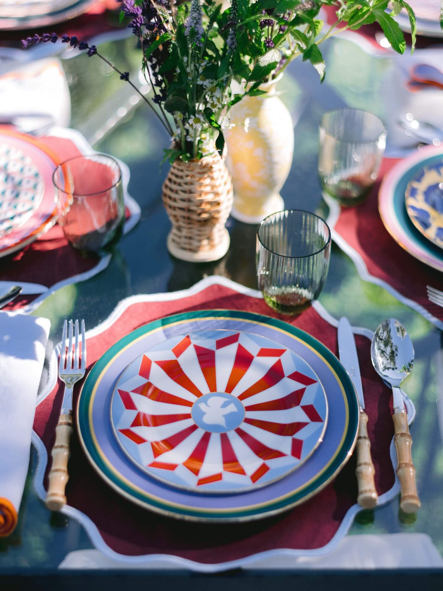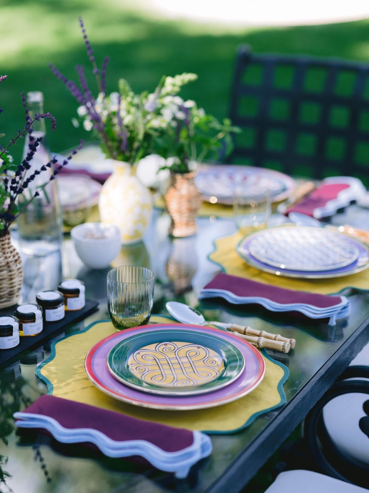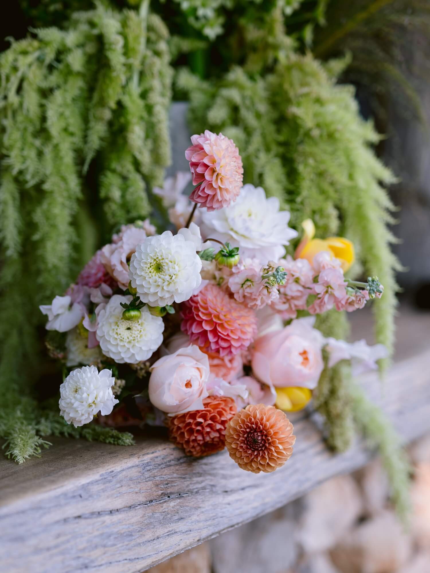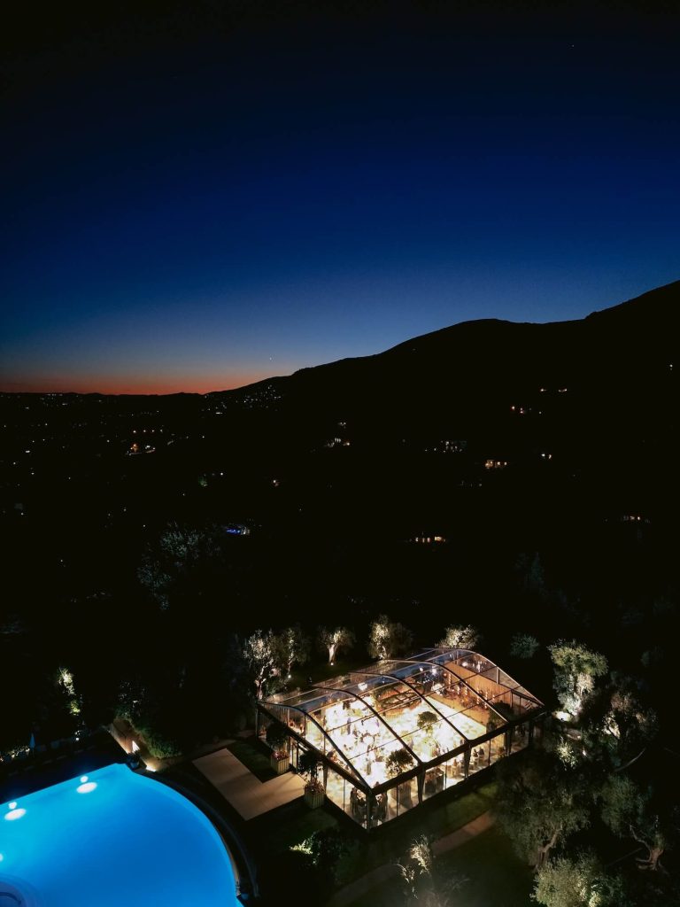 The design continued through the grounds with intimate outdoor lounges nestled beneath ancient olive trees, where guests gathered among soft neutral furnishings accented with delicate floral posies. Walshe’s floral direction leaned into a painterly palette reminiscent of Impressionist gardens, combining delicate dahlias, pansies, ranunculus and wild textures to create arrangements that felt abundant yet organic. Tables were dressed with crisp white linens, sculptural stone vessels and golden candlelight, while elegant porcelain and glassware added refined European charm. Each arrangement appeared as though freshly gathered from a blooming garden, reinforcing the sense of effortless luxury that defined the celebration.