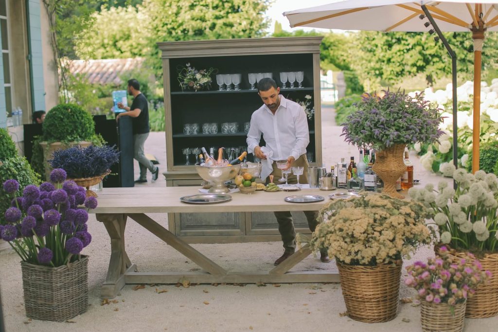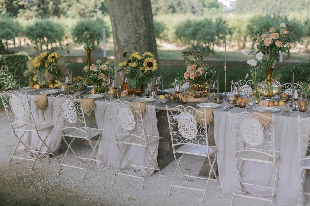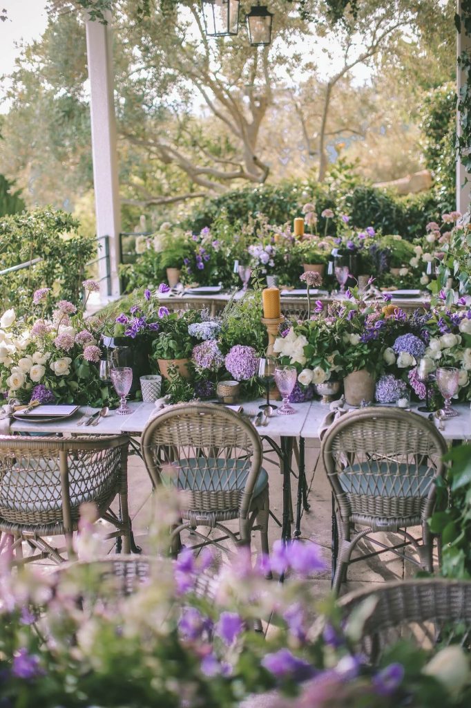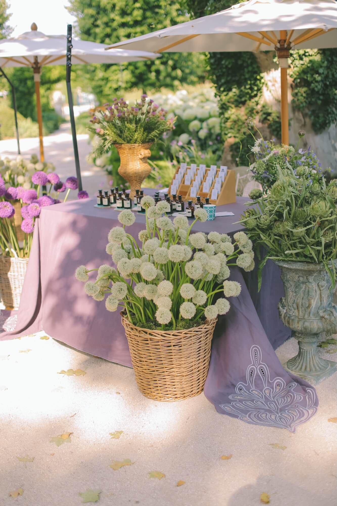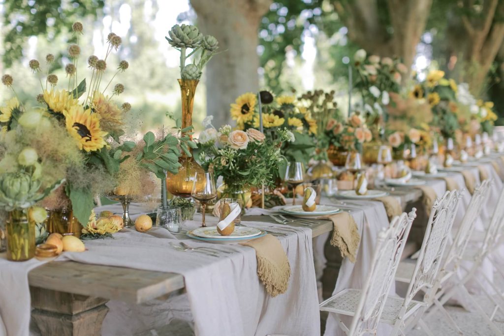 The floral design drew inspiration from the textures and colours of the Provençal landscape itself. Walshe combined garden roses, delphinium, allium, hydrangea, and seasonal foliage in loose, painterly arrangements that felt organic yet luxurious. Fruit elements such as grapes, artichokes, and figs were woven subtly into the tablescape, adding depth and a nod to the region’s abundant harvest. The surrounding reception areas echoed the same natural elegance: shaded cocktail spaces were adorned with baskets of flowers, herbaceous plants, and stone urns overflowing with greenery, creating a seamless transition between the estate’s architecture and the curated floral styling.