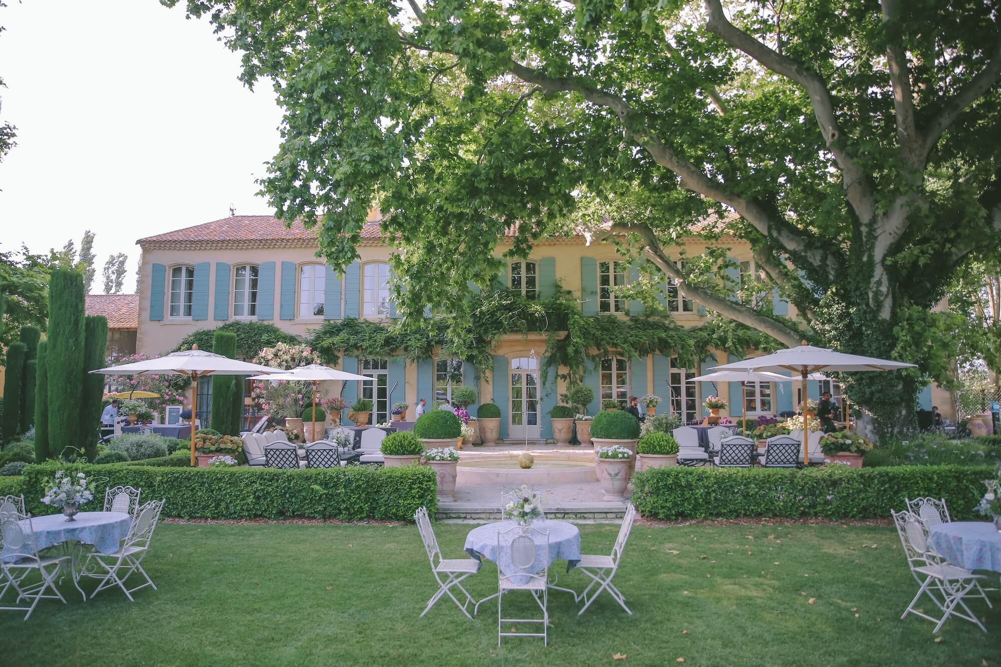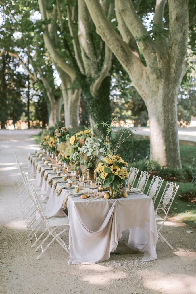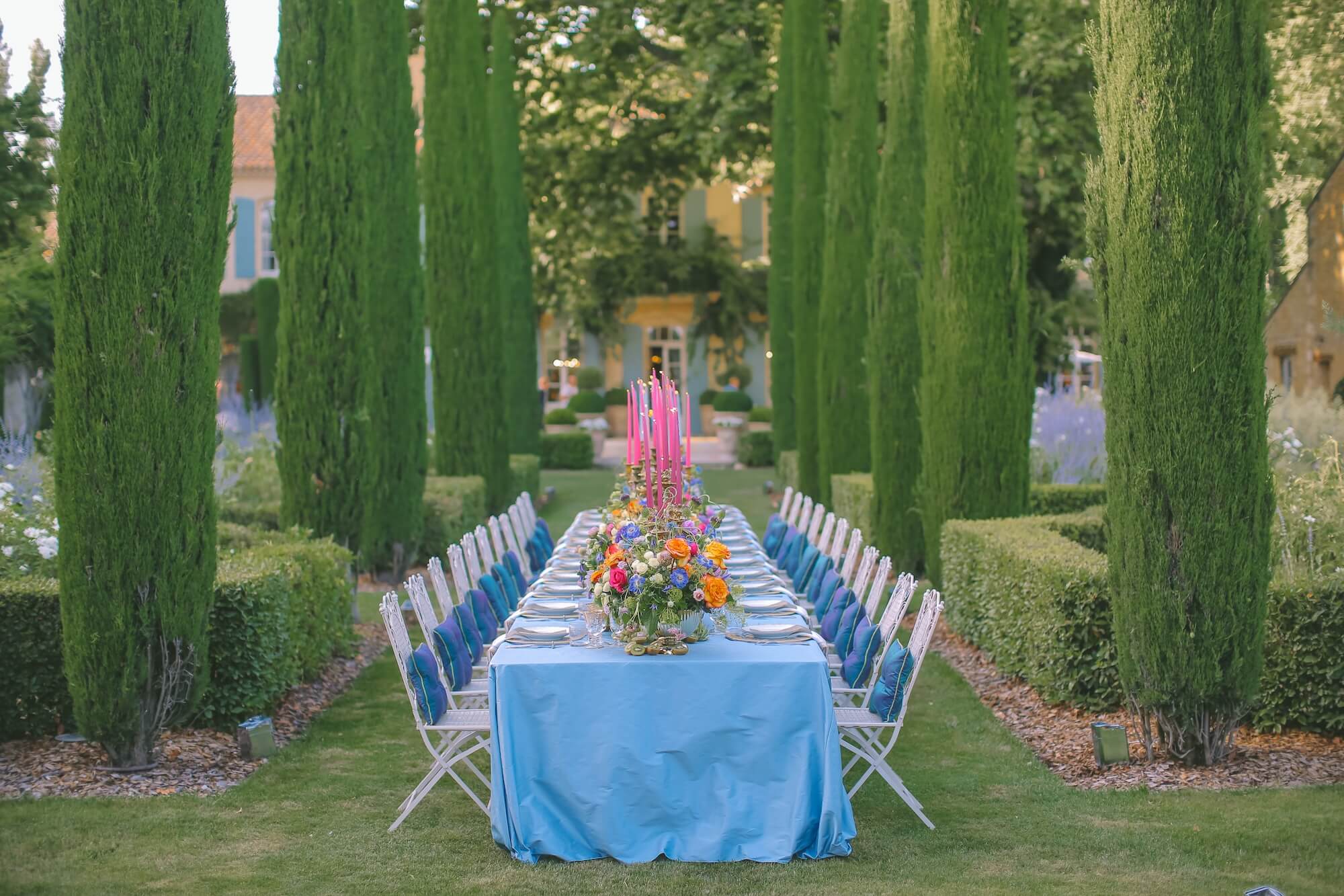 Larry Walshe conceived this contemporary wedding in Provence as a celebration of colour, light, and the effortless elegance of the South of France. Set within the manicured gardens of a Provençal estate, the design centred on a dramatic alfresco dining experience beneath rows of towering cypress trees.