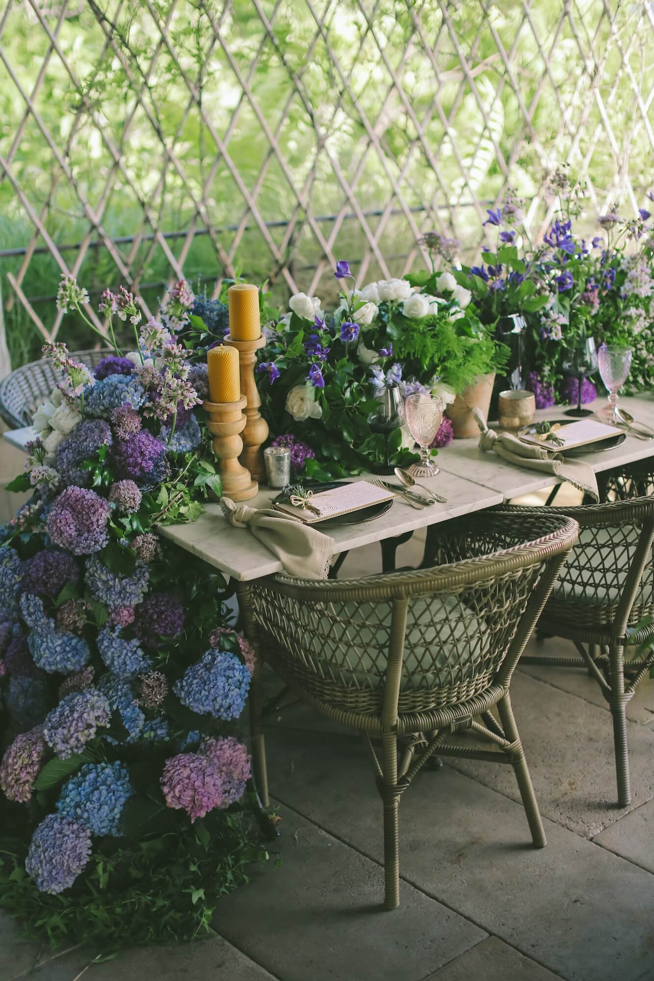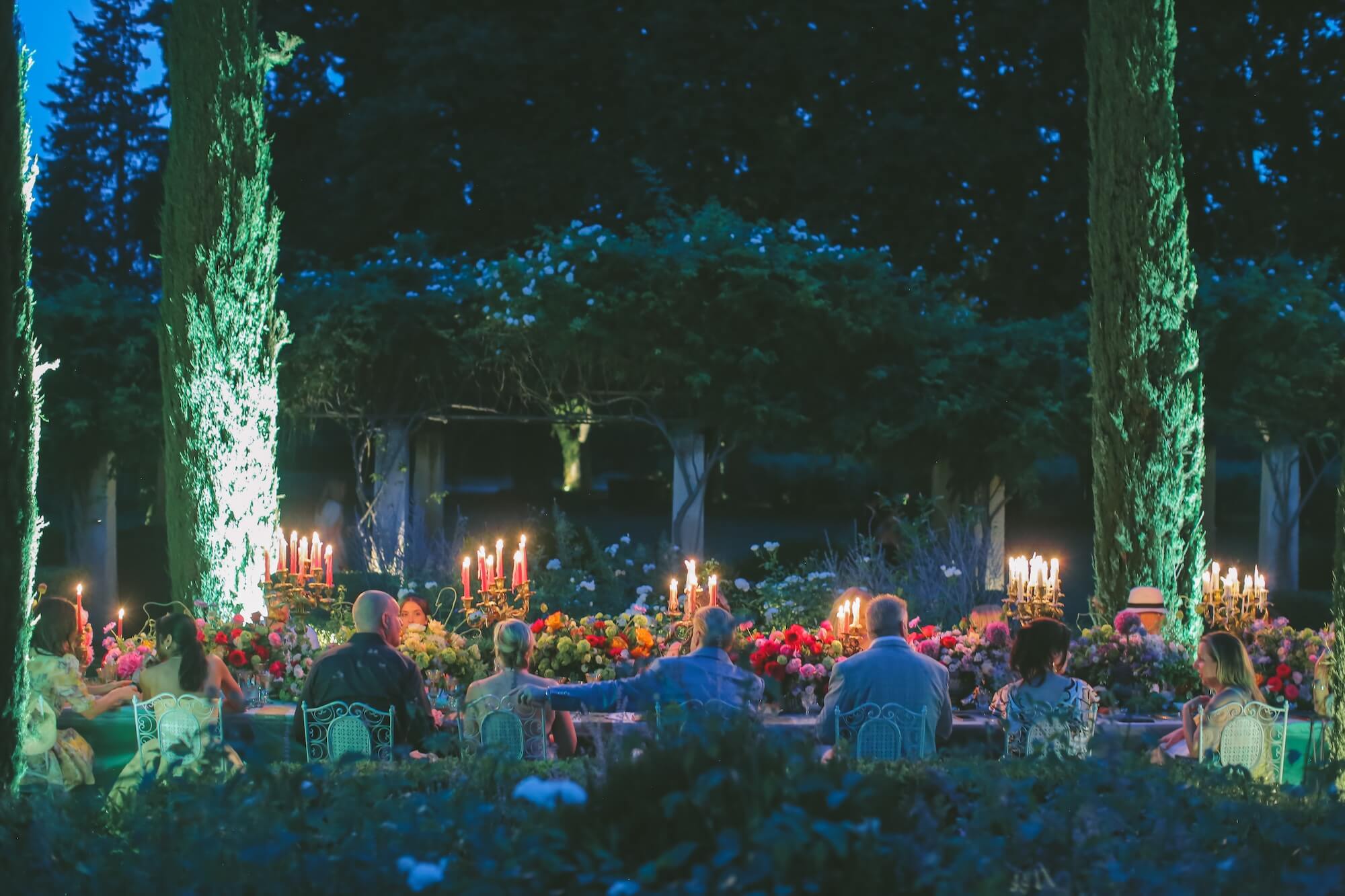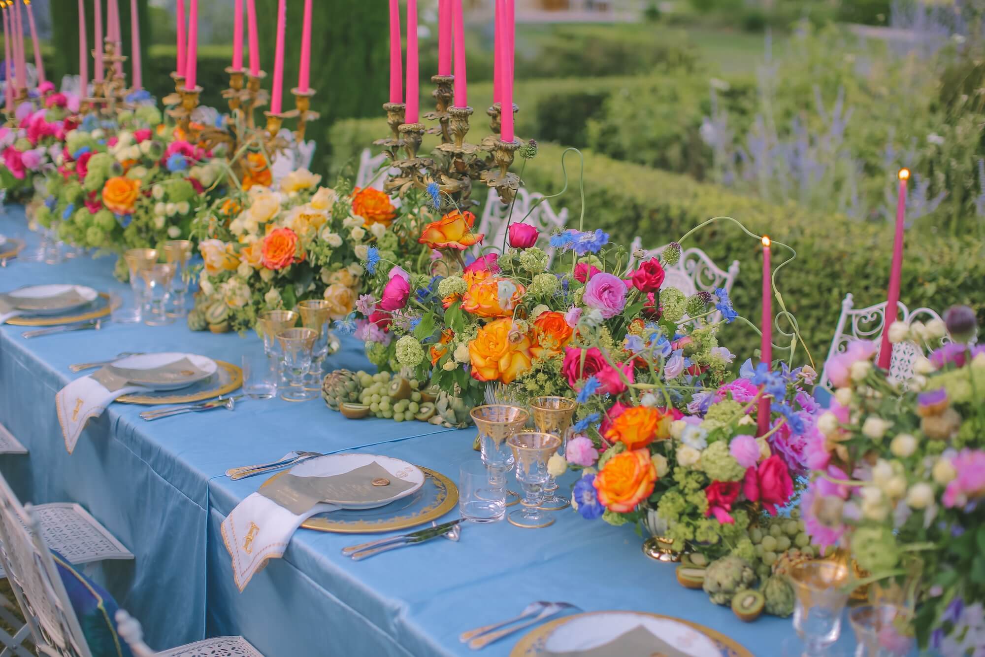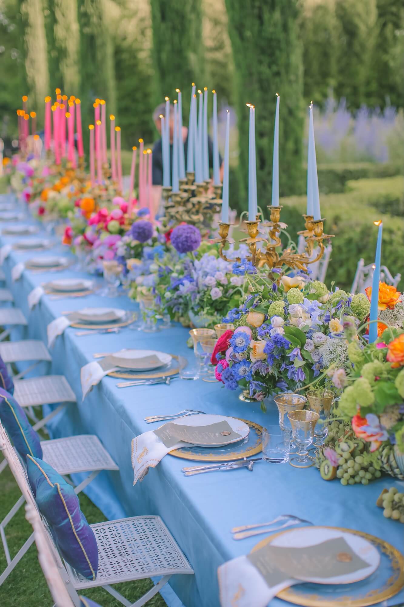 A long banquet table dressed in soft sky-blue linens created a striking contrast against the lush greenery, while abundant floral arrangements in vivid shades of coral, fuchsia, saffron, lavender, and soft blue evoked the wild romance of summer gardens. Antique gold candelabras and tall taper candles in blush pink and powder blue added a refined layer of vertical drama, guiding the eye down the entire length of the table and establishing a sense of theatrical symmetry.