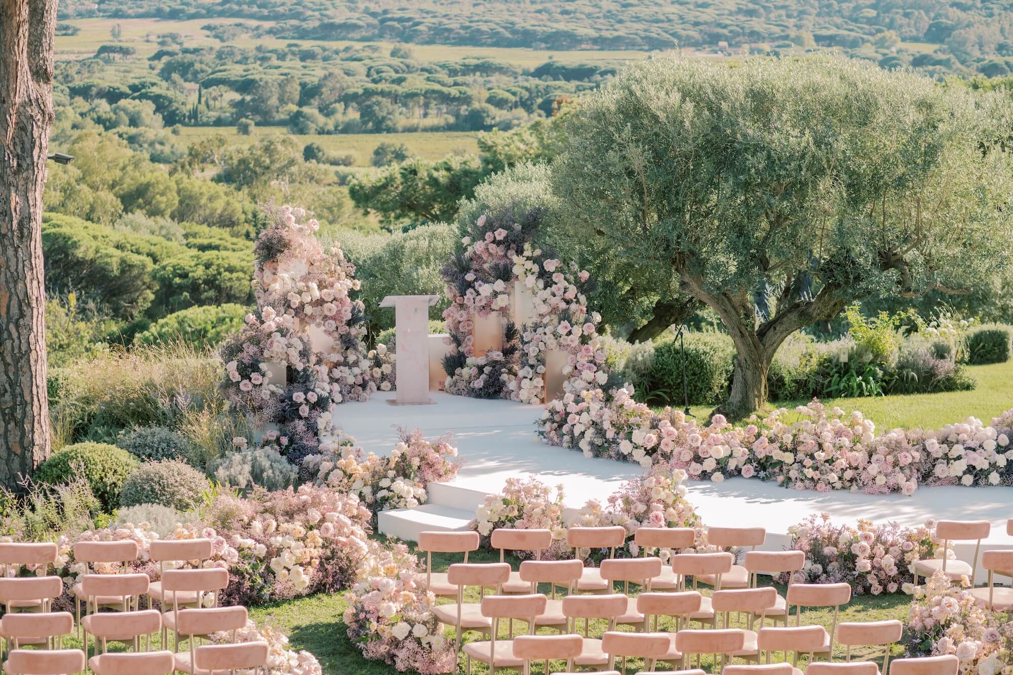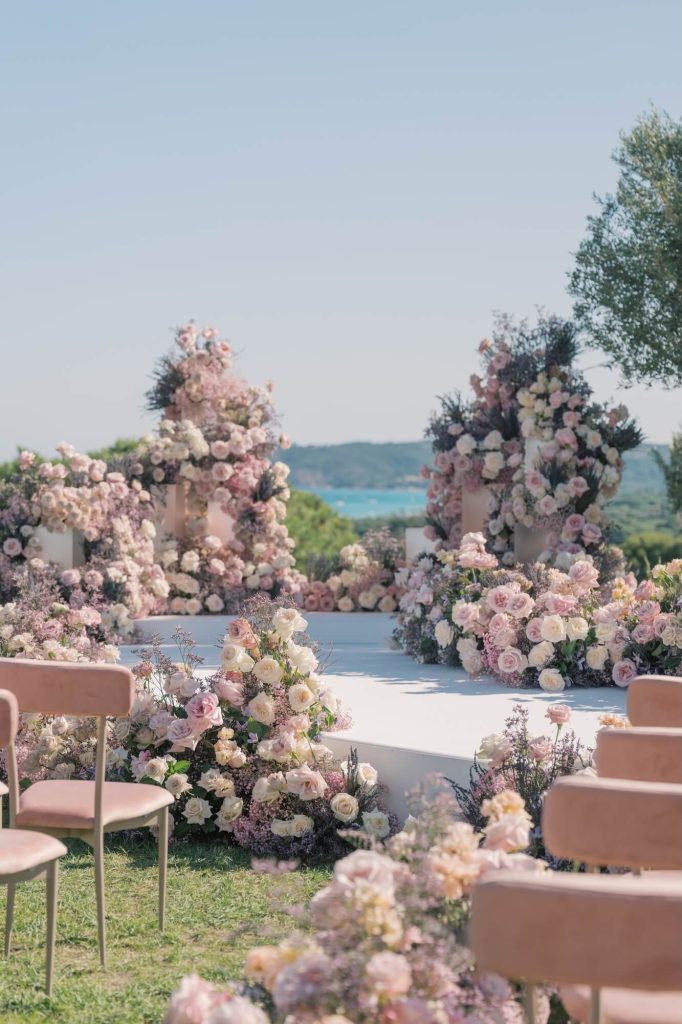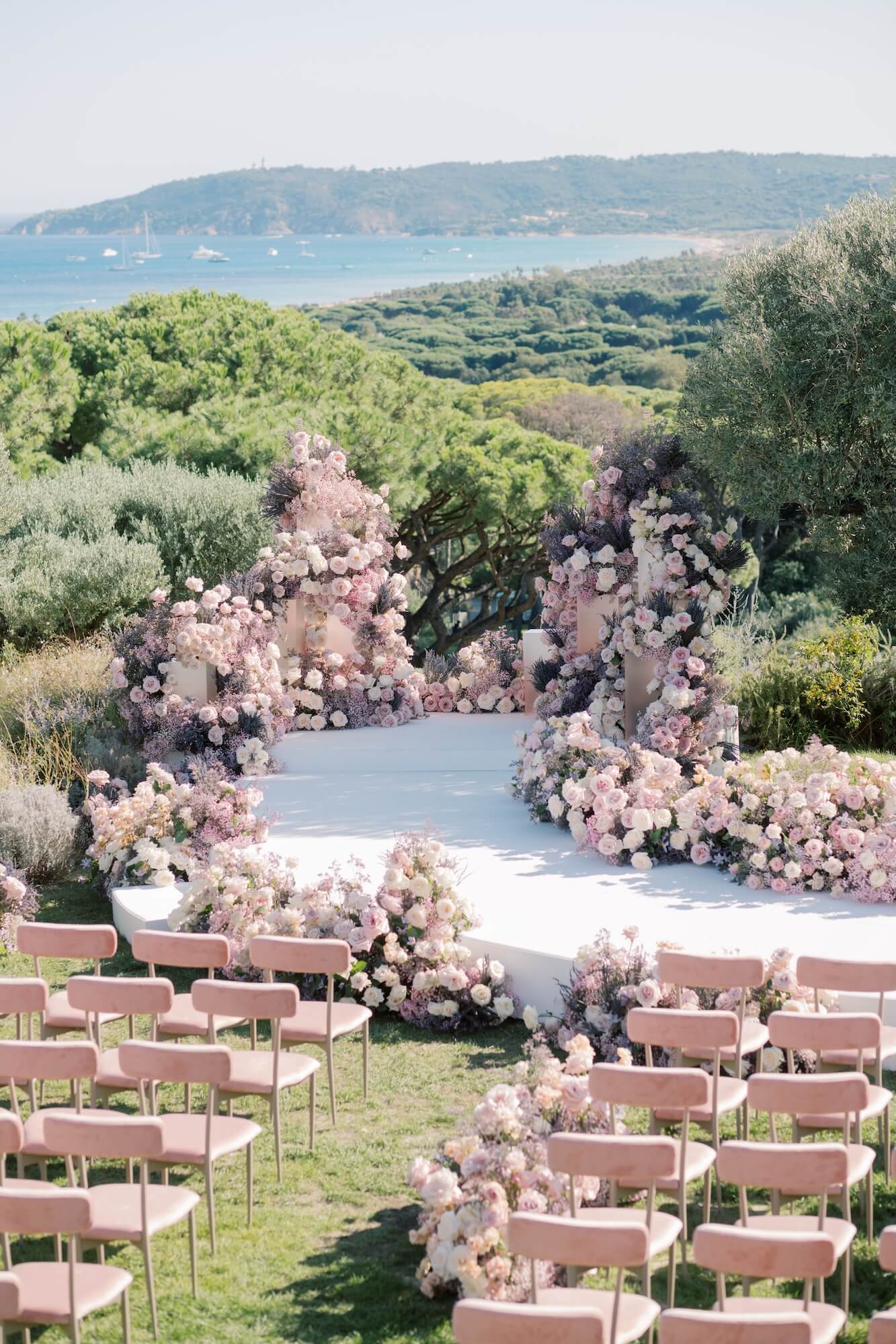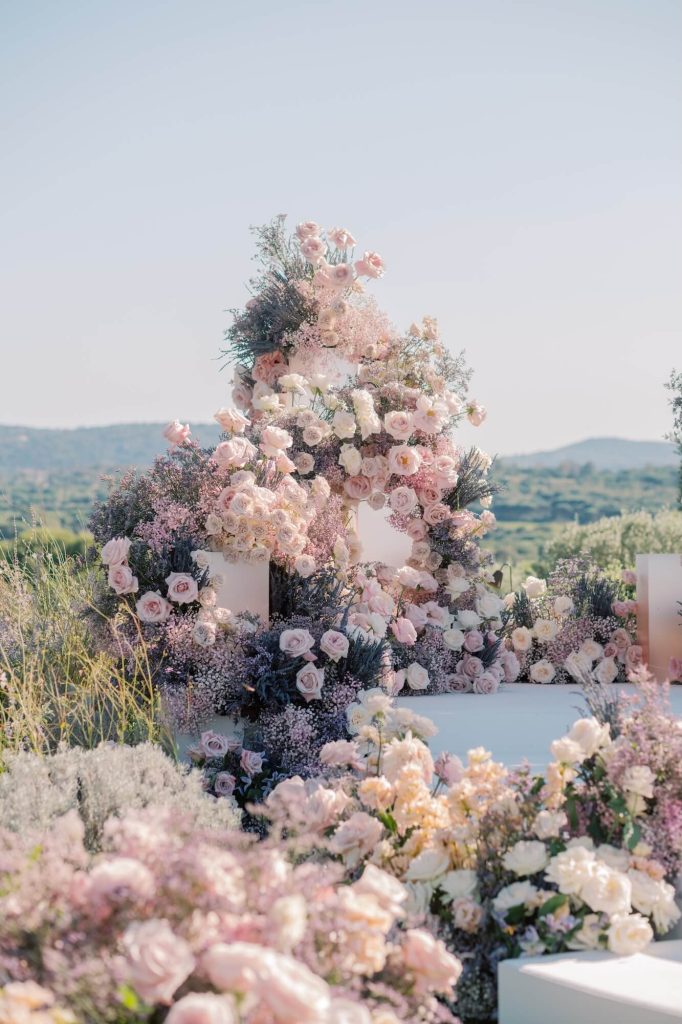Abundant arrangements of blush, cream, and soft lavender blooms—primarily garden roses, ranunculus, and delicate seasonal textures—cascaded across architectural plinths, forming a floral altar that felt both organic and intentional. The palette mirrored the surrounding scenery, with the pastel florals echoing the soft light of the Riviera and the pale sky meeting the sea in the distance.