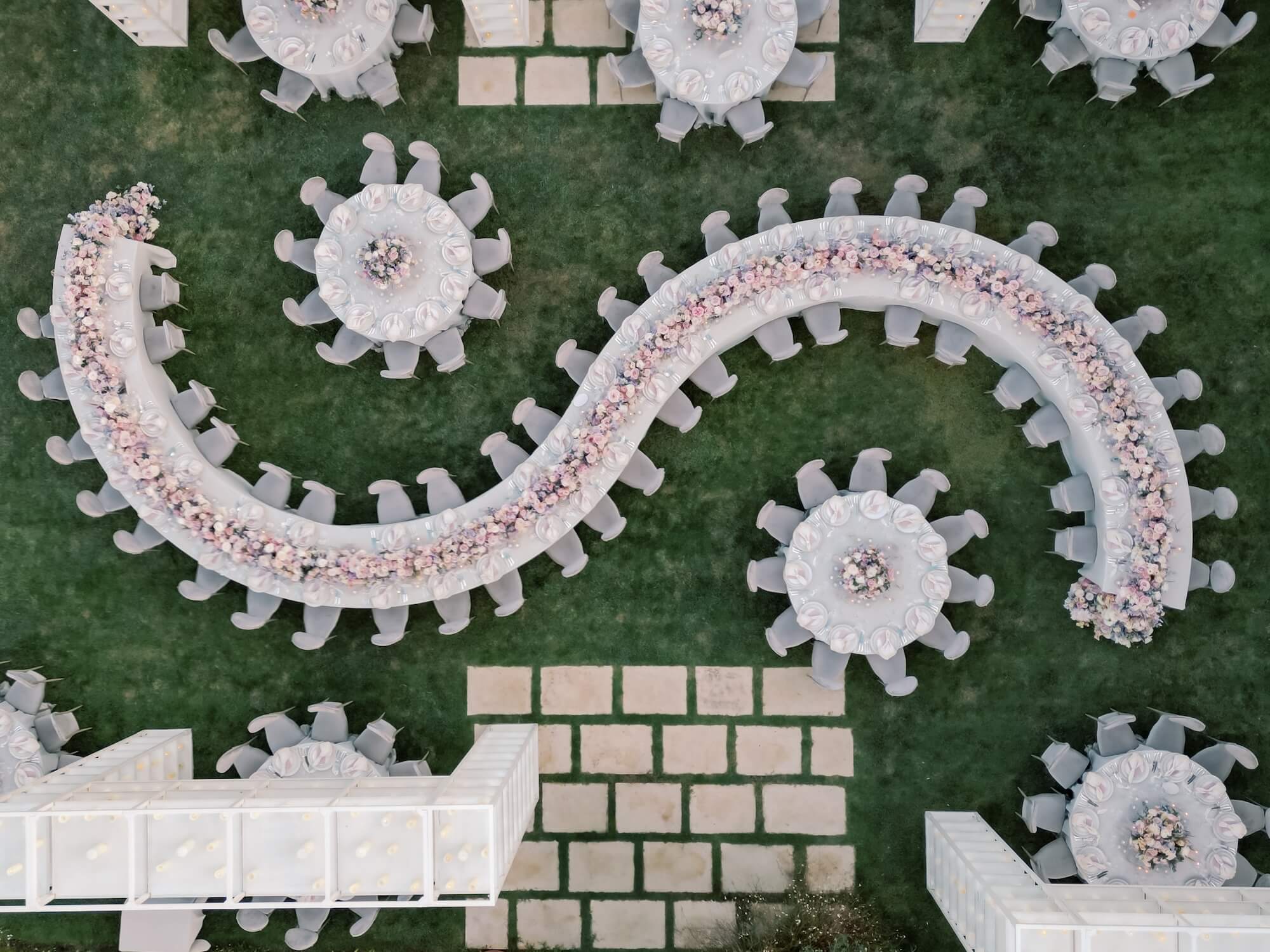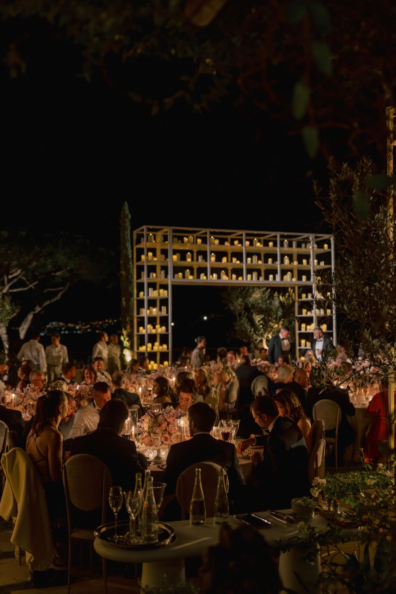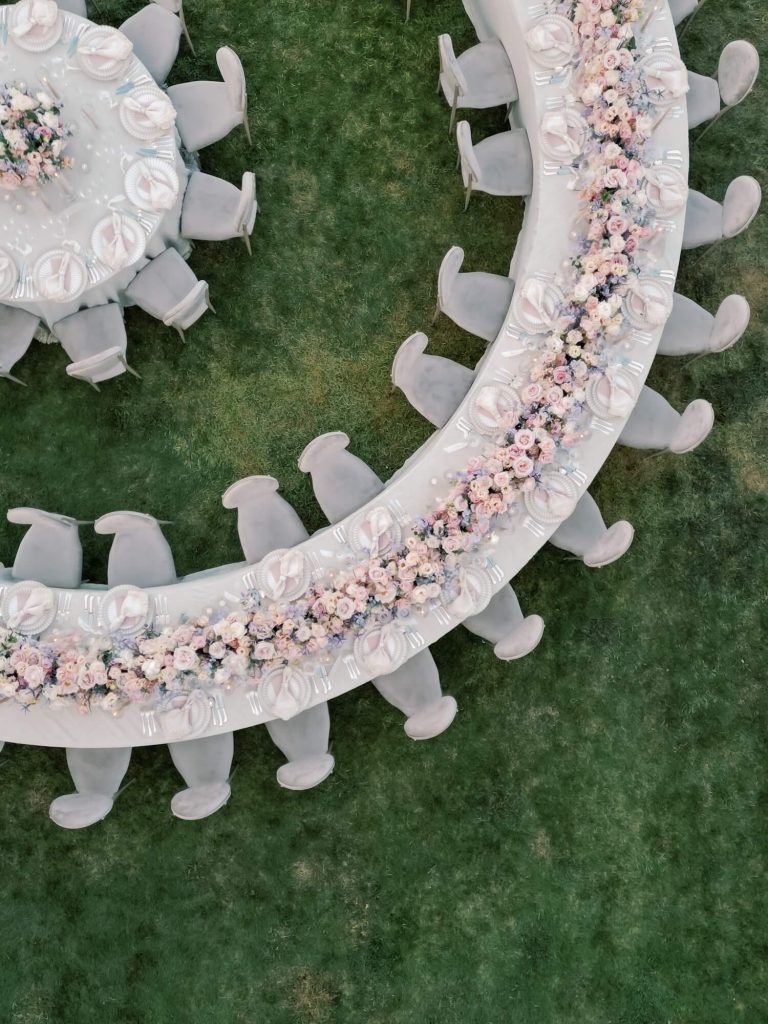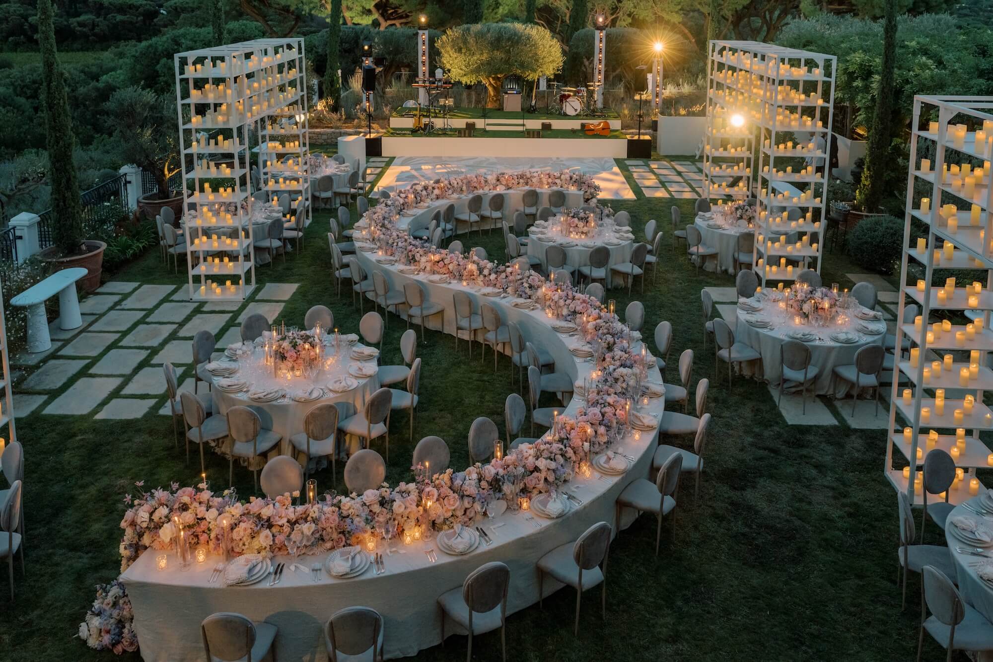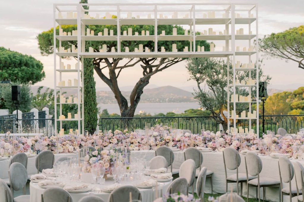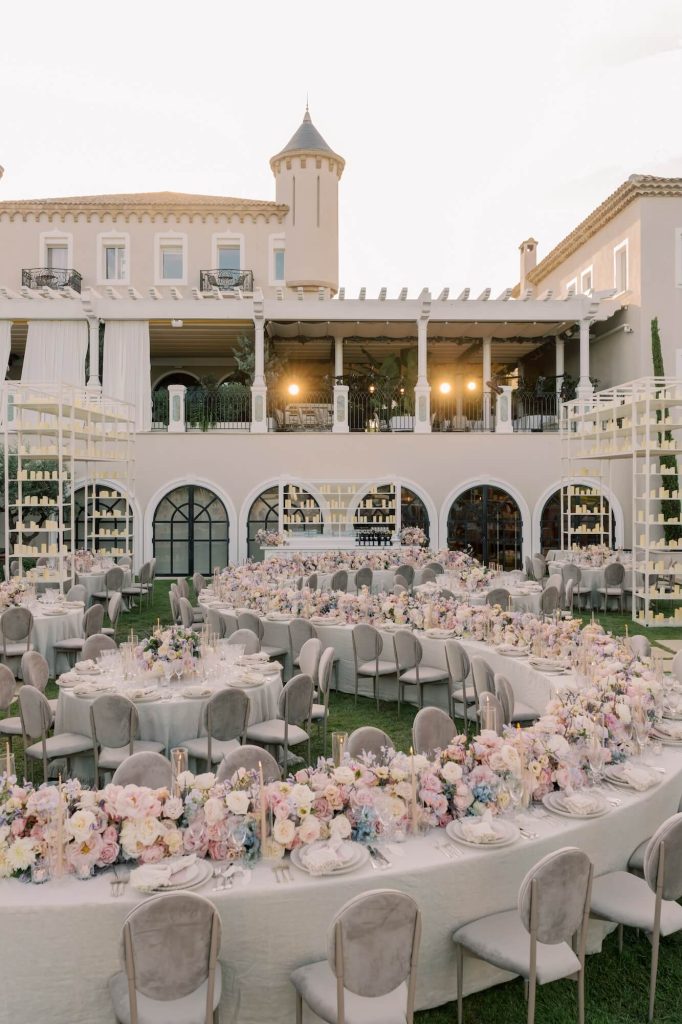 For the reception, Larry Walshe Studios transformed the château’s garden terrace into a sophisticated alfresco dining experience. A dramatic serpentine table became the focal point of the design, winding gracefully through the space and adorned with a continuous runner of romantic florals that mirrored the ceremony palette. Round guest tables were interspersed to create rhythm and intimacy, each dressed with refined linens, delicate tableware, and sculptural glass candlelight. Towering white shelving structures filled with hundreds of glowing candles framed the dining area, adding vertical drama while maintaining a minimalist aesthetic that complemented the château’s elegant architecture.