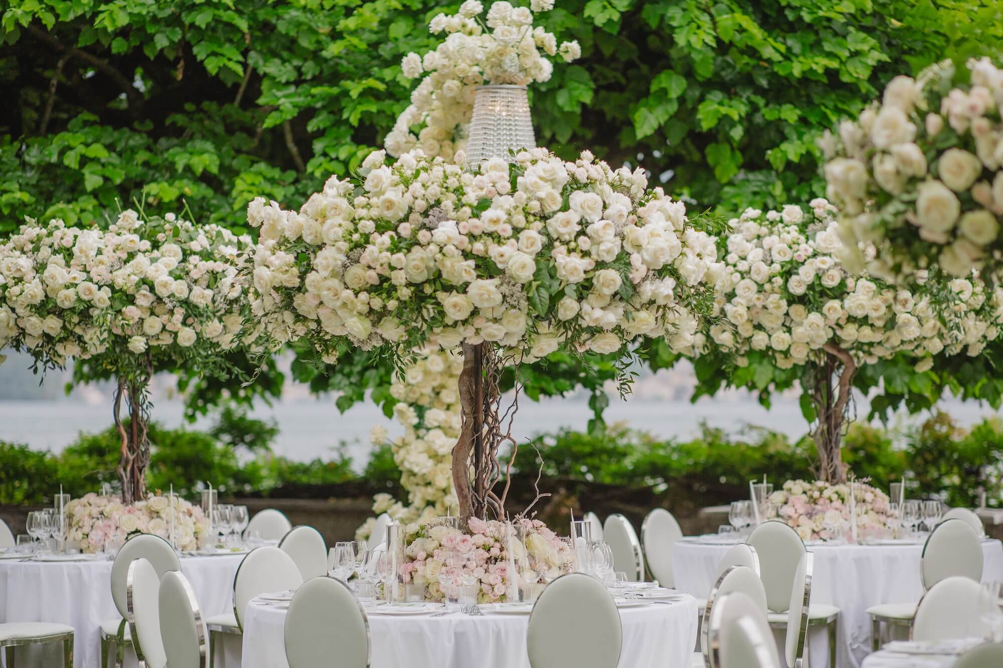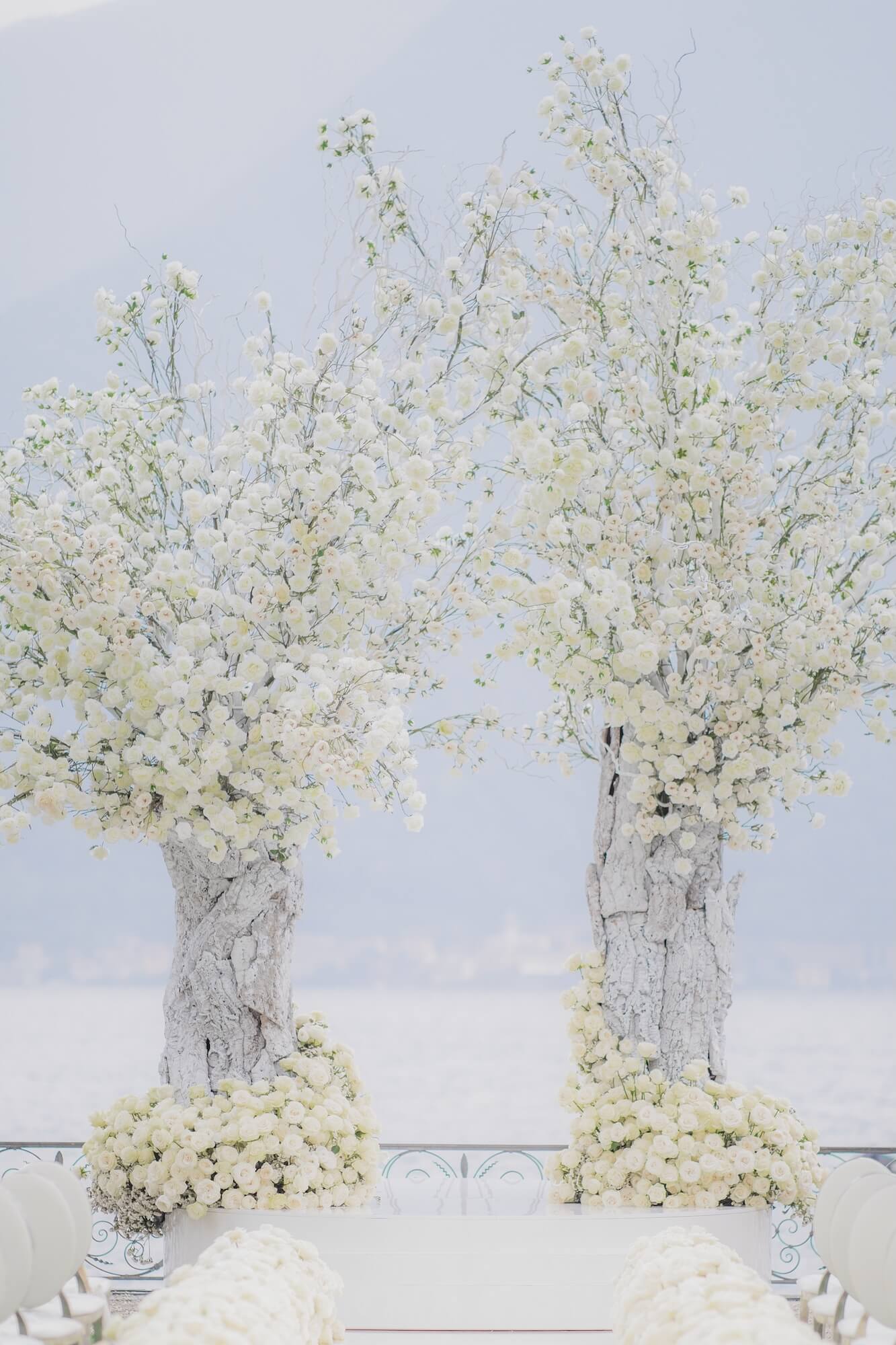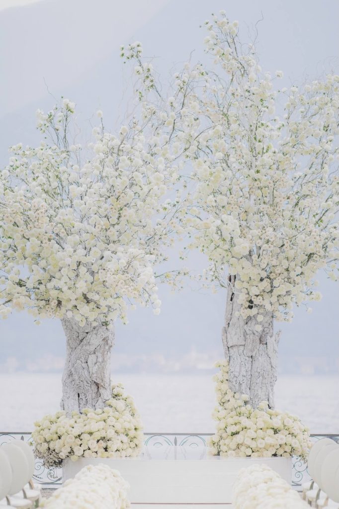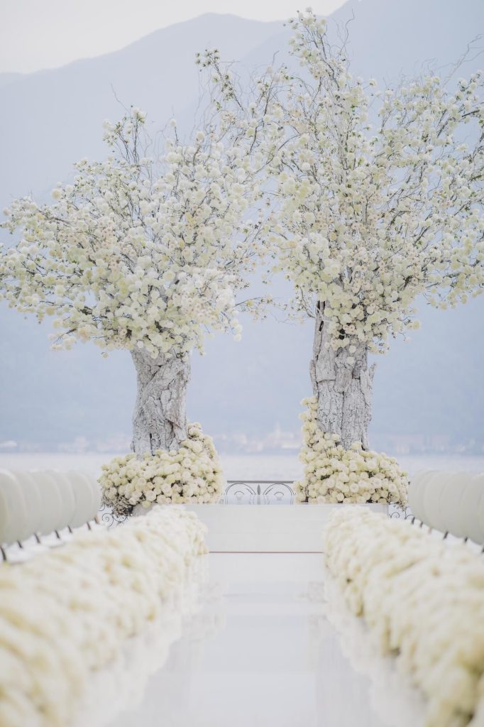Along the ceremony aisle, dense banks of white roses created a cloud-like pathway leading toward the lake, where monumental tree structures appeared to grow organically from textured, bark-like trunks. Their airy canopies of delicate white blooms and twisting branches echoed the natural landscape beyond, blurring the line between artful installation and living garden.