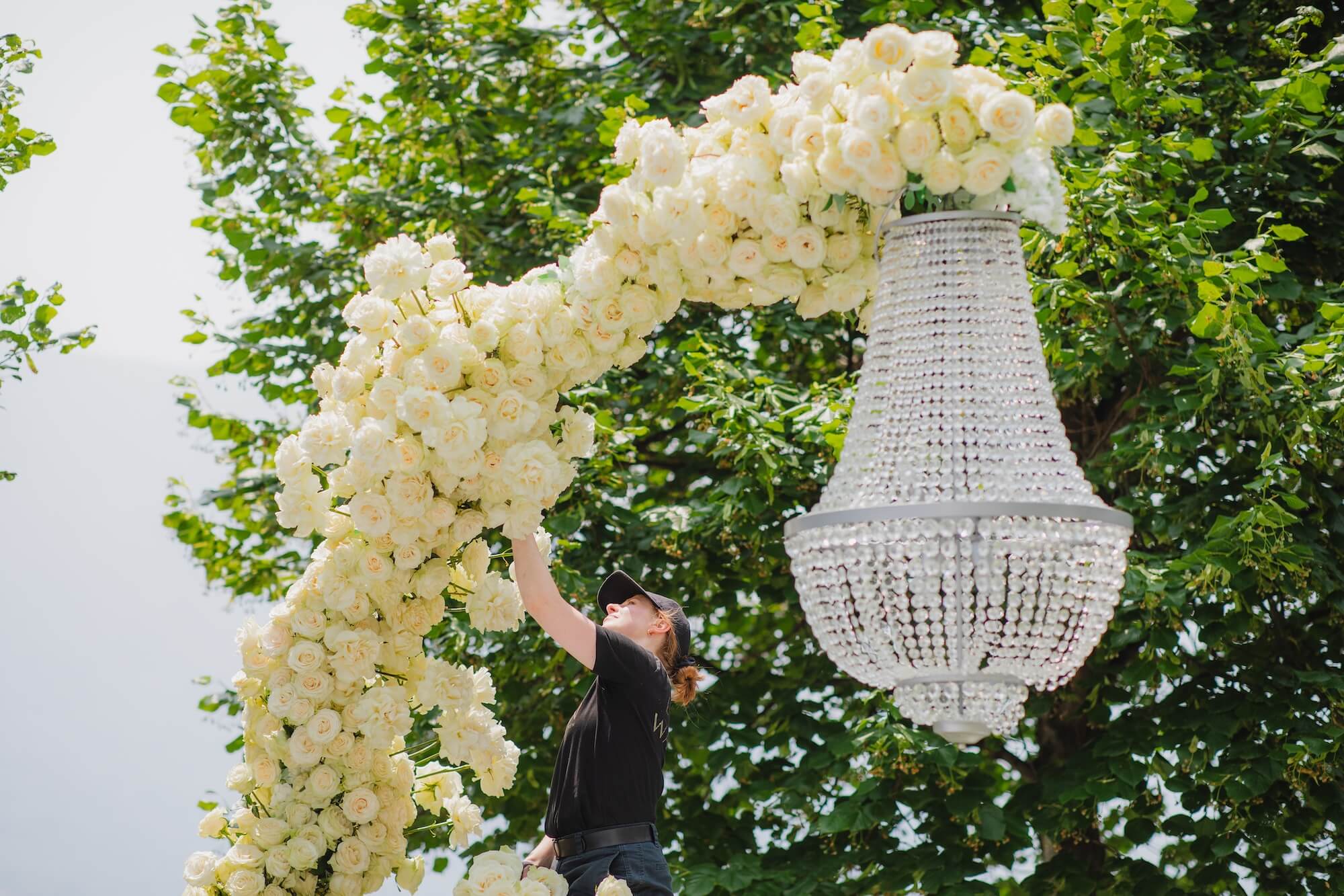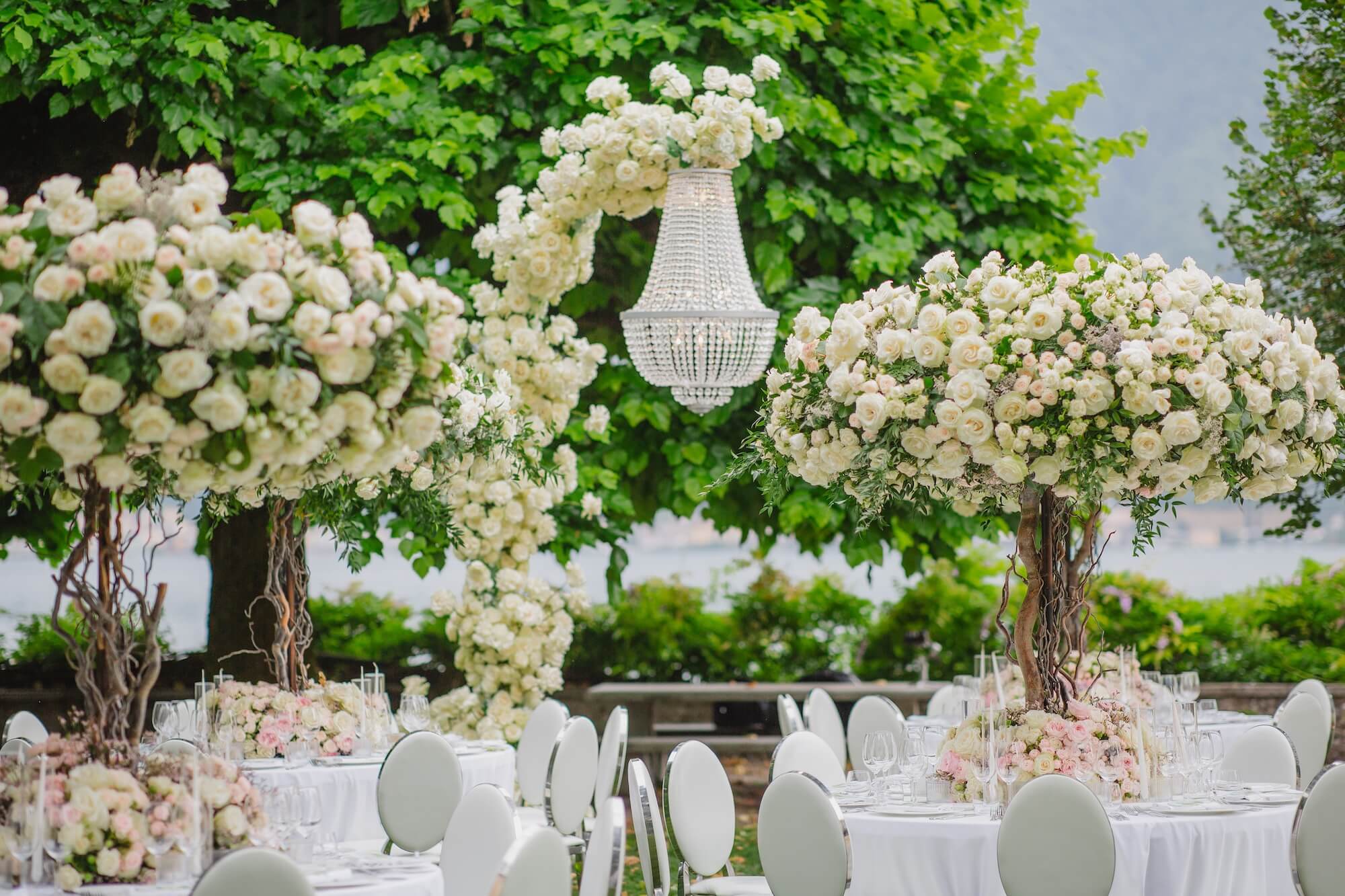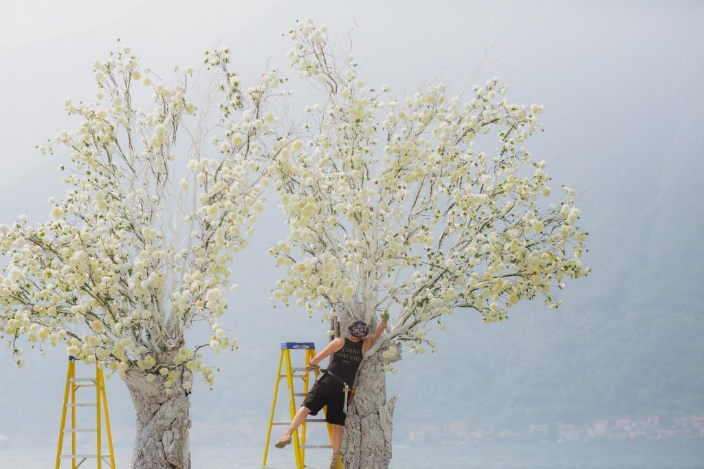 Along the ceremony aisle, dense banks of white roses created a cloud-like pathway leading toward the lake, where monumental tree structures appeared to grow organically from textured, bark-like trunks. Their airy canopies of delicate white blooms and twisting branches echoed the natural landscape beyond, blurring the line between artful installation and living garden.