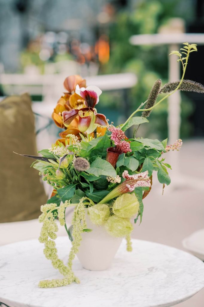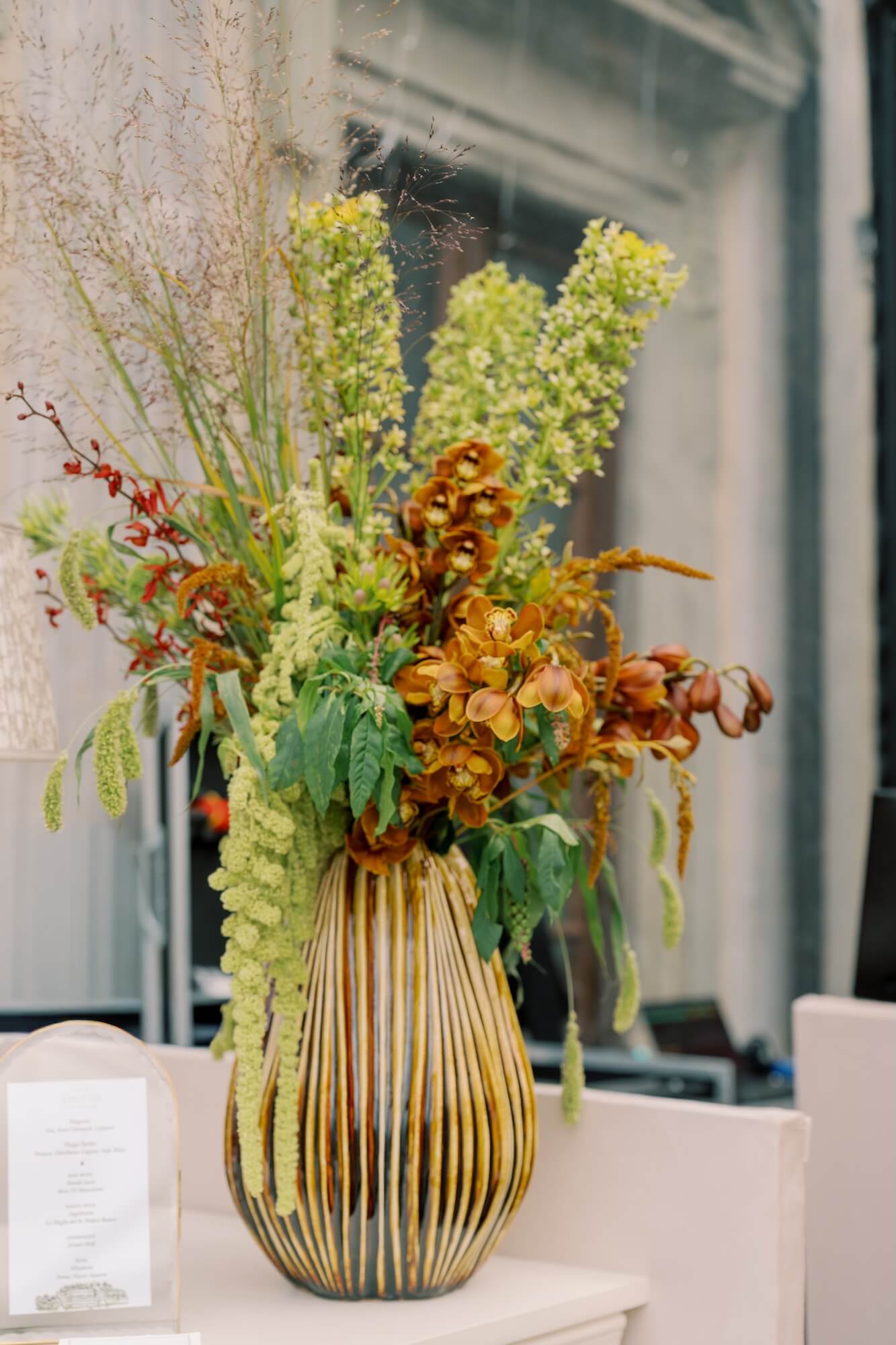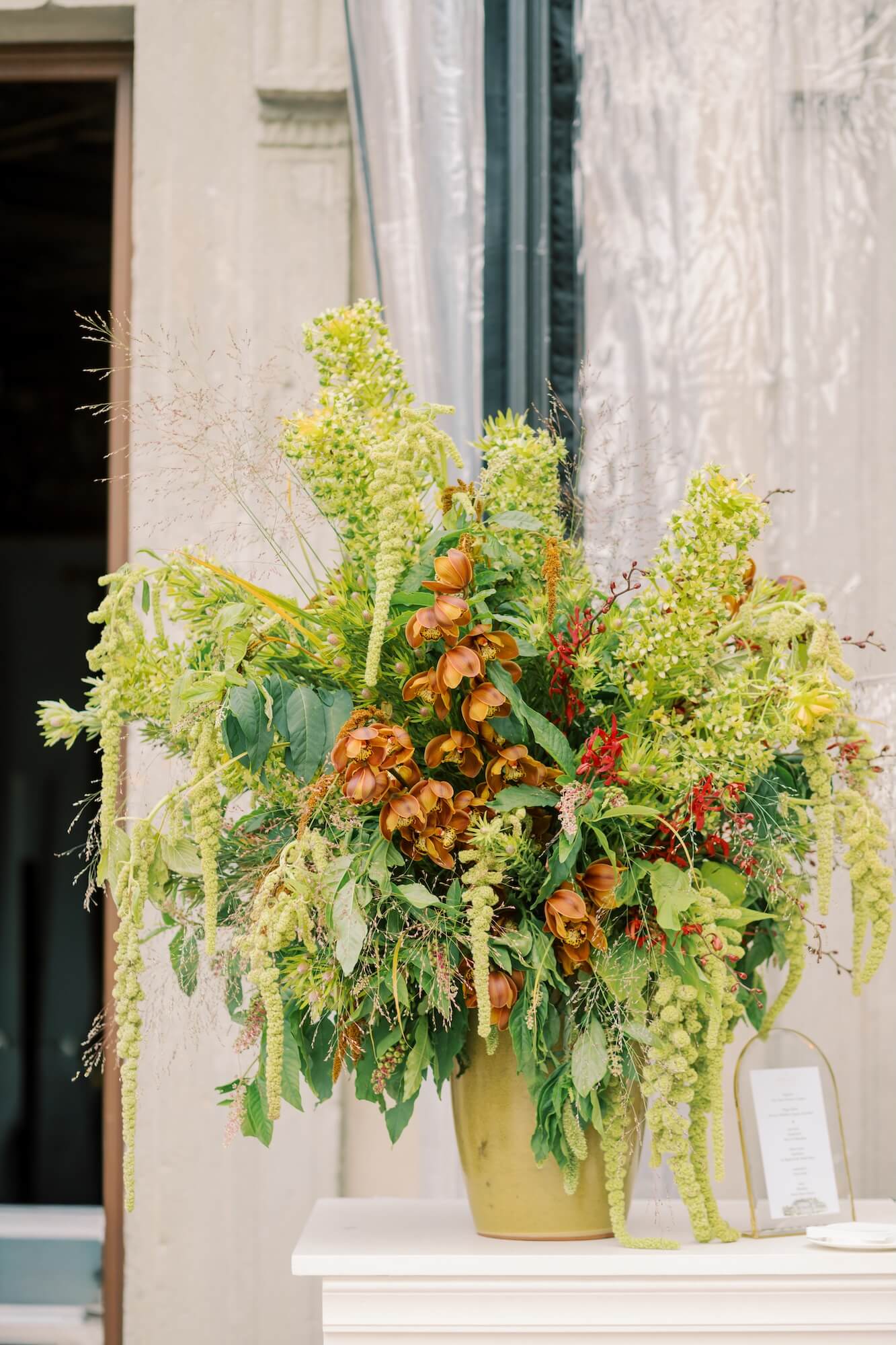 Layers of fresh green tones were punctuated with rich bronze orchids and subtle hints of red, creating depth and contrast while maintaining a refined, natural palette that harmonised beautifully with the Italian landscape.